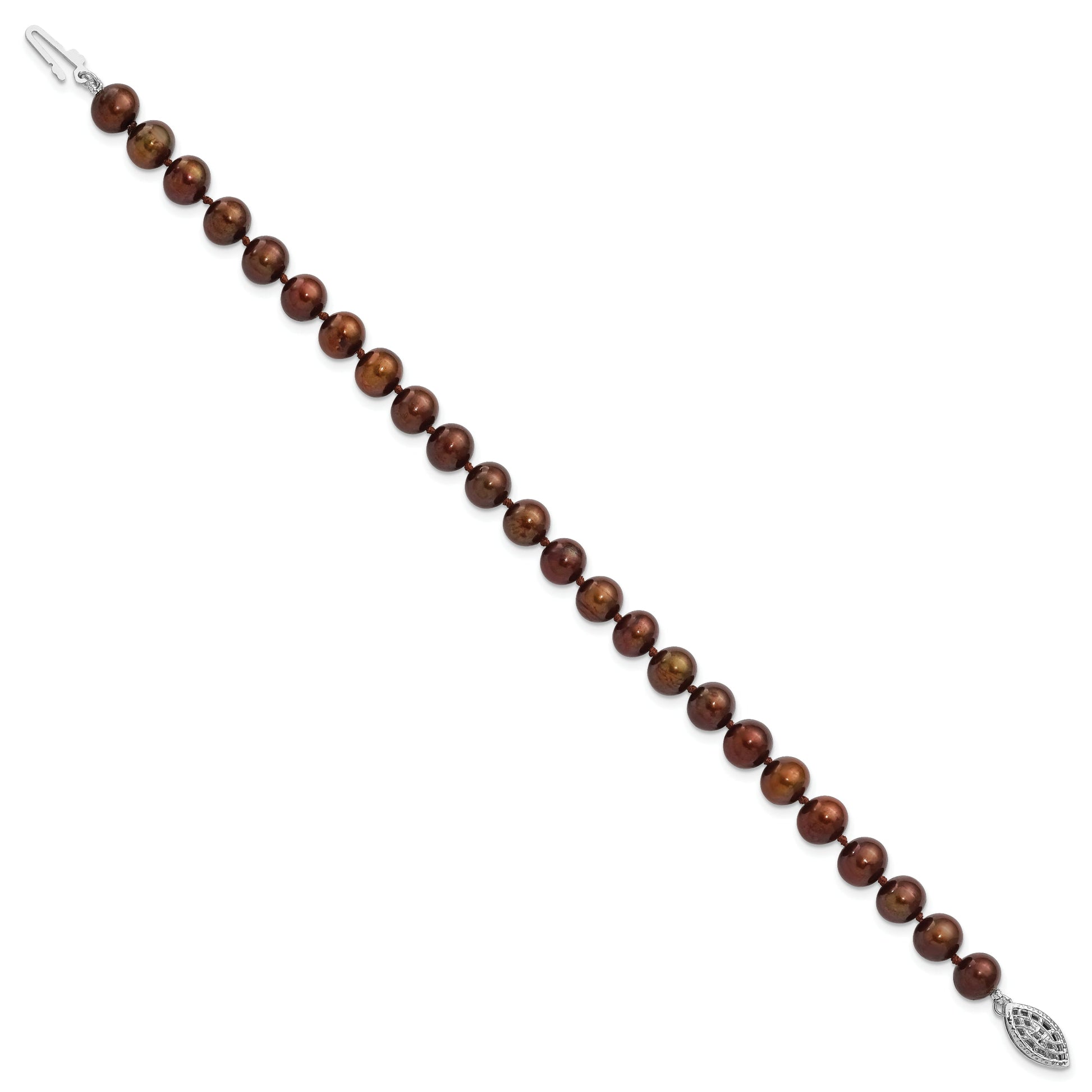 Elevate your style with this exquisite 7.25-Inch Sterling Silver Rhodium-Plated Bracelet. It's adorned with enchanting 6-7mm brown freshwater cultured pearls that shimmer elegantly. Crafted from 925 sterling silver with a polished finish, it exudes timeless sophistication. The rhodium plating ensures durability and resists tarnishing, making it perfect for everyday wear. The bracelet features a secure pearl clasp and solid die-struck design, ensuring reliability and elegance. The near-round pearls, artfully dyed, highlight rich earth tones. Experience luxury with this 7.25-Inch Sterling Silver Rhodium-Plated Pearl Bracelet and feel the timeless allure of fine jewelry.