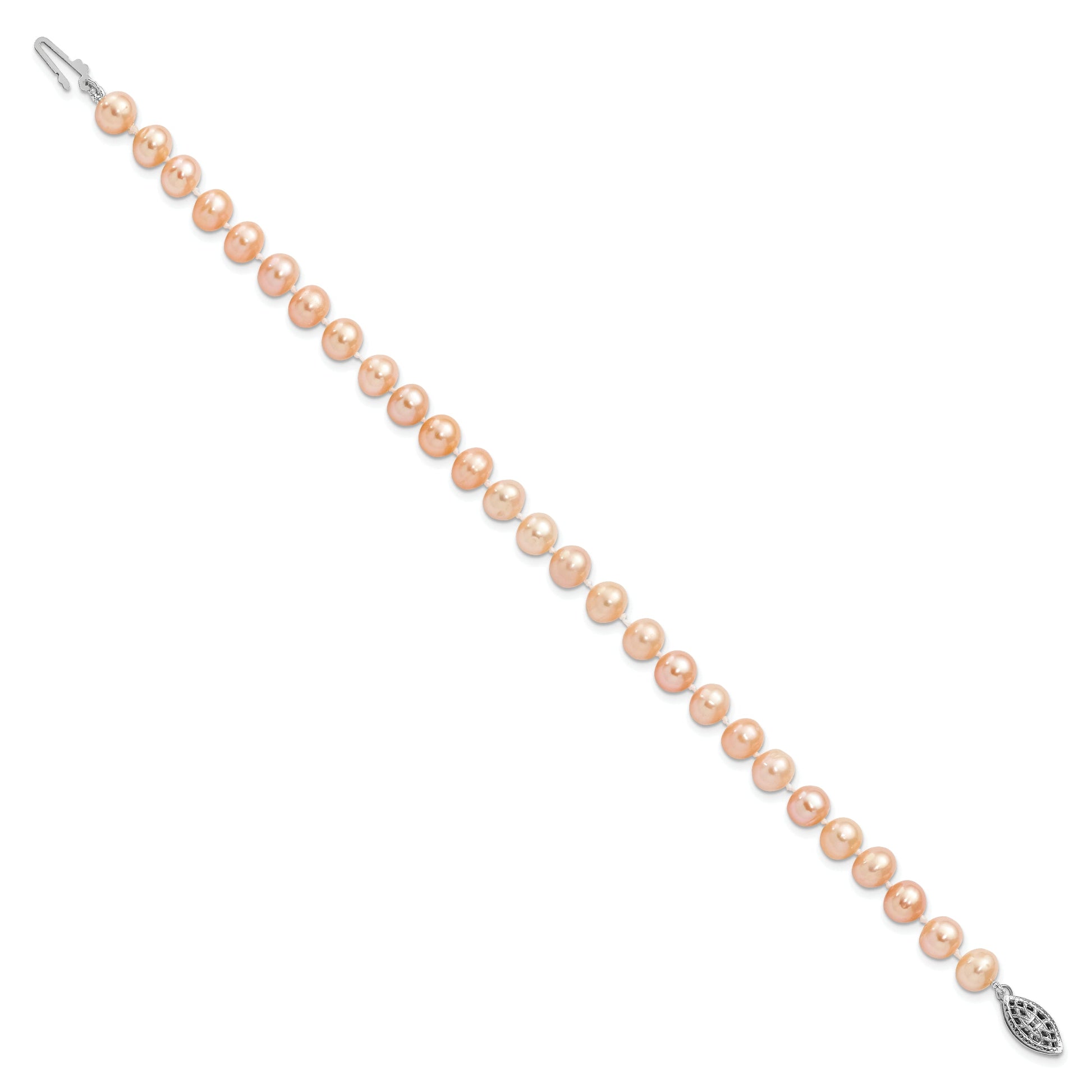 The 7.25 Inch Sterling Silver Rhodium-Plated Pink Freshwater Pearl Bracelet exudes elegance and grace. Crafted from high-purity 925 sterling silver, this bracelet features stunning 6-7mm near-round pink freshwater pearls. The rhodium plating adds a touch of shine, enhancing the beauty of the pink pearls. With a polished finish and solid construction, this bracelet offers a timeless style. The delicate yet durable pearl clasp ensures it stays securely on your wrist. Measuring 7.25 inches in length, this piece fits comfortably, adding sophistication to any ensemble. Choose the 7.25 Inch Sterling Silver Rhodium-Plated Pink Freshwater Pearl Bracelet for everlasting style.