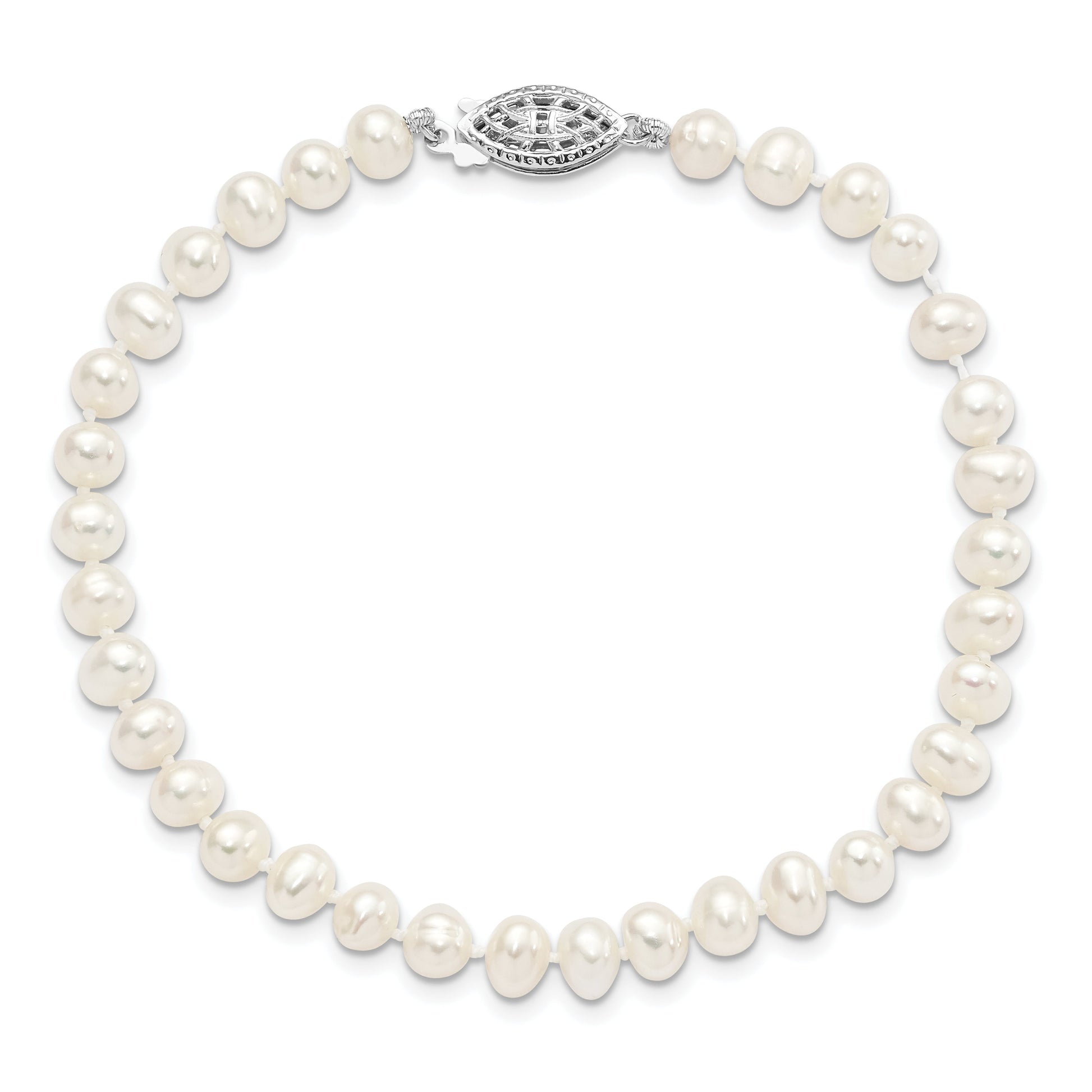 Radiate timeless elegance with this 7.25 Inch Sterling Silver Rhodium White Freshwater Cultured Pearl Bracelet. Crafted from 925 sterling silver, each gem showcases near-round, 5 to 6mm pearls that shimmer in classic white. The rhodium plating adds a touch of sophistication while enhancing the bracelet's durability and shine. Skillfully die-struck, this solid bracelet boasts a secure clasp that ensures ease of wear. Perfect for any occasion, it complements a wide range of styles. Elevate your jewelry collection with the charm and grace of this exquisite pearl bracelet.
