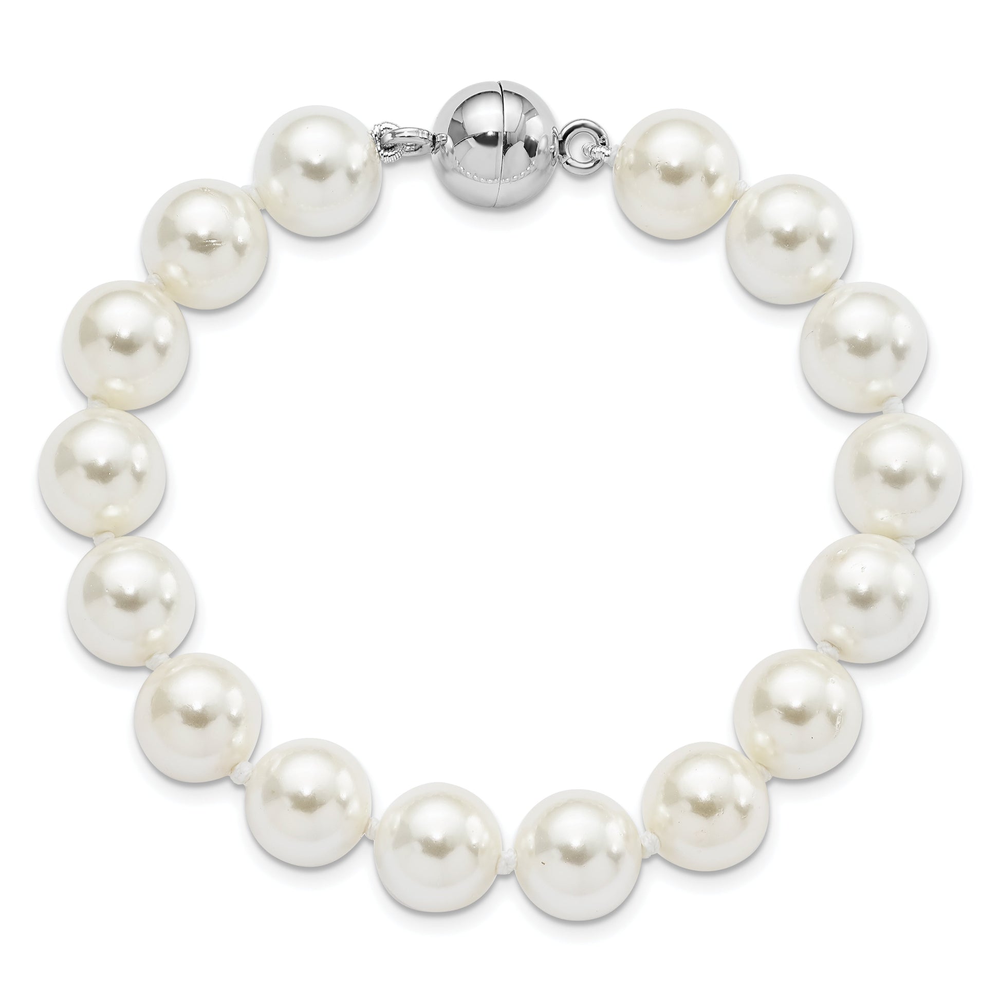 Introducing the 7.5 Inch Majestic Sterling Silver Rhodium-Plated White Imitation Shell Pearl Bracelet. This exquisite piece of jewelry features 10-11mm white shell pearls, each hand-knotted for lasting quality. Made from 925 sterling silver and coated with a sleek rhodium plating, this bracelet offers both elegance and durability. Its magnetic clasp ensures easy wear and removal. Ideal for any occasion, this 7.5-inch bracelet arrives in a charming gift pouch, making it a thoughtful present. The 7.5 Inch Majestic Sterling Silver Rhodium-Plated Bracelet is a stunning addition to any jewelry collection.