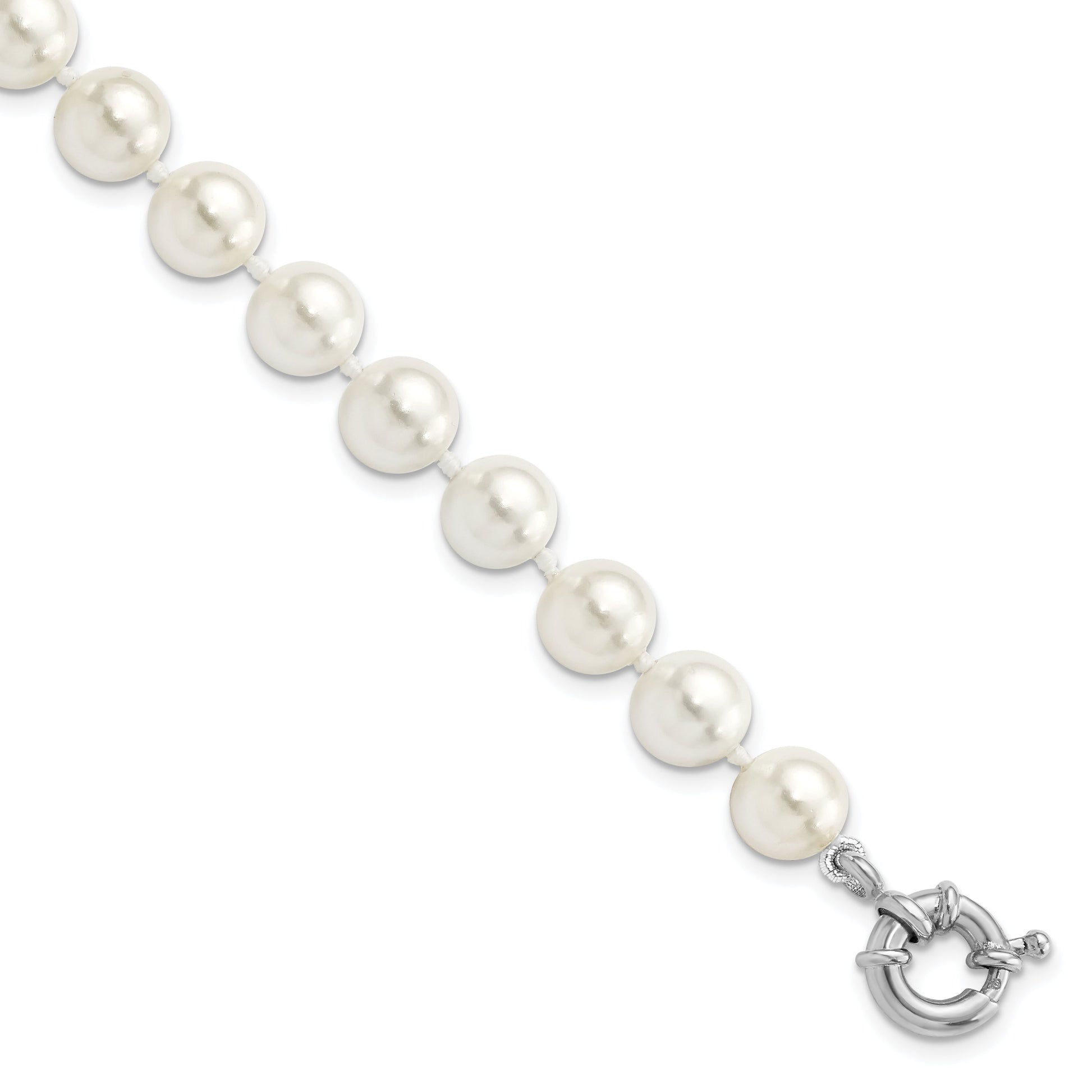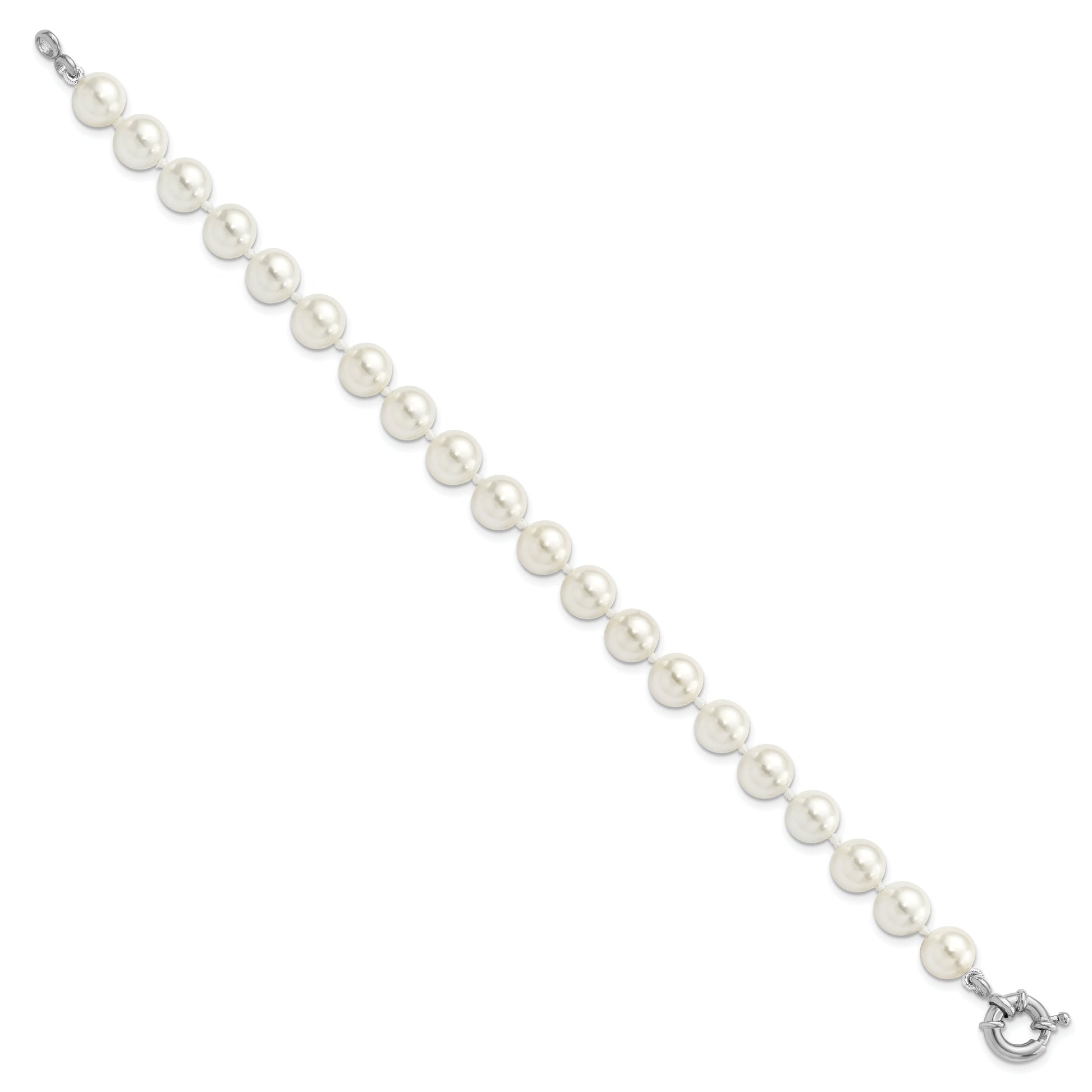 The 7.5 Inch Majestik Sterling Silver Rhodium-Plated White Imitation Shell Pearl Bracelet exudes timeless elegance. Crafted with impeccable care, this bracelet features radiant 8-9mm synthetic shell pearls, hand-knotted on a sleek sterling silver chain. The rhodium plating enhances its silver tone, giving it a polished finish that catches the light beautifully. Its 7.5-inch length and magnetic clasp ensure a snug yet effortless fit. Packaged in a charming gift pouch, it makes an exquisite gift for someone special. Elevate your accessory game with the 7.5 Inch Majestik Shell Pearl Bracelet and embrace classic sophistication.