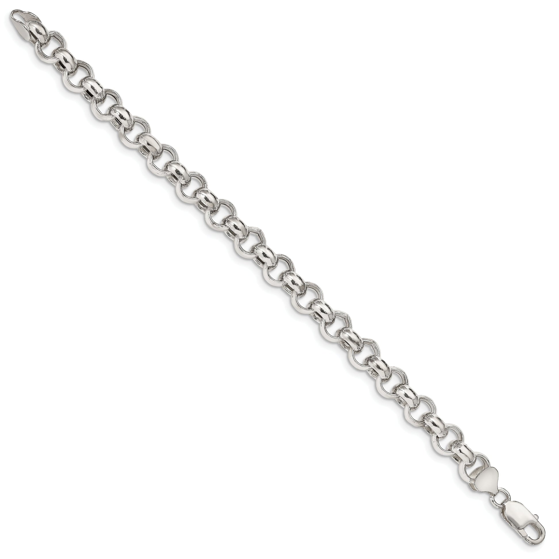 The 7.5 Inch Sterling Silver 9.5mm Semi-Solid Rolo Chain is a stunning piece crafted for elegance and style. Made from 925 sterling silver, its polished finish gives a refined touch. The 7.5-inch length and 9.5mm width offer a pleasing presence on the wrist, making it ideal for any occasion. Its semi-solid structure ensures durability without sacrificing comfort. The lobster clasp provides both security and ease of wear. This bracelet features an anti-tarnish coating, preserving its pristine look. The 7.5 Inch Sterling Silver 9.5mm Semi-Solid Rolo Chain is a must-have for any woman's jewelry collection.