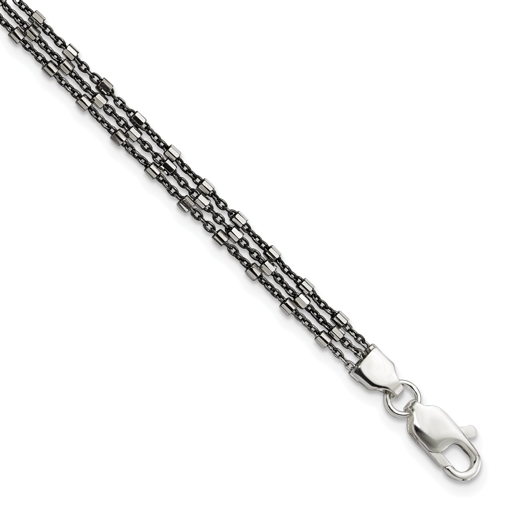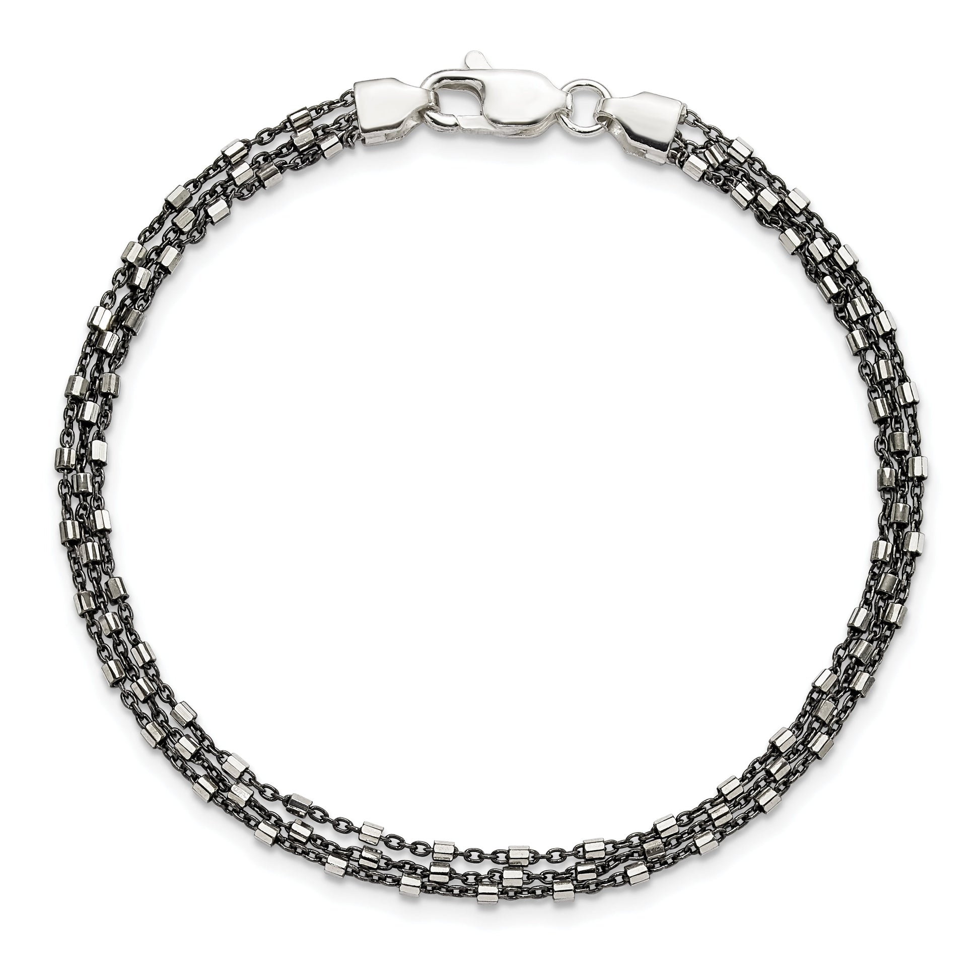 Dive into elegance with the 7.5 Inch Sterling Silver Ruthenium-Plated Multi-Chain 3 Strand Bracelet. This eye-catching piece, crafted from polished 925 sterling silver, combines sophistication and modern allure. The sleek ruthenium plating offers a stunning contrast with its black color against the bright white silver. Its fancy multi-strand chain design is both unique and fashionable, perfect for those who love to make a statement. Complete with a secure lobster clasp, this bracelet is designed to easily fit wrists up to 7.5 inches. Embrace style and class with the Sterling Silver Ruthenium-Plated Multi-Chain Bracelet.