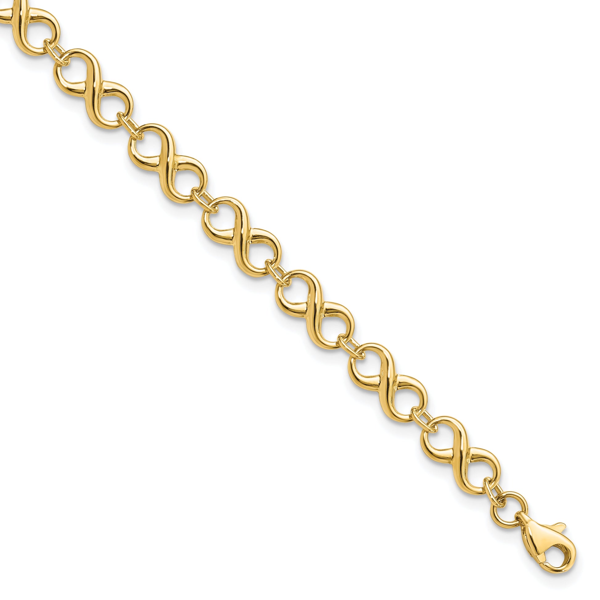 The 7 Inch 14K Polished Infinity Bracelet is a stunning piece of jewelry that radiates elegance and sophistication. Crafted from pure 14K yellow gold, this bracelet measures 7 inches in length and features a 5 mm width, making it a standout accessory for any occasion. Its polished finish adds a touch of sparkle, while the semi-solid chain ensures durability. The fancy lobster clasp provides secure closure, allowing for easy wear. With its timeless design and lifetime guarantee, the 7 Inch 14K Polished Infinity Bracelet is a must-have addition to your jewelry collection.