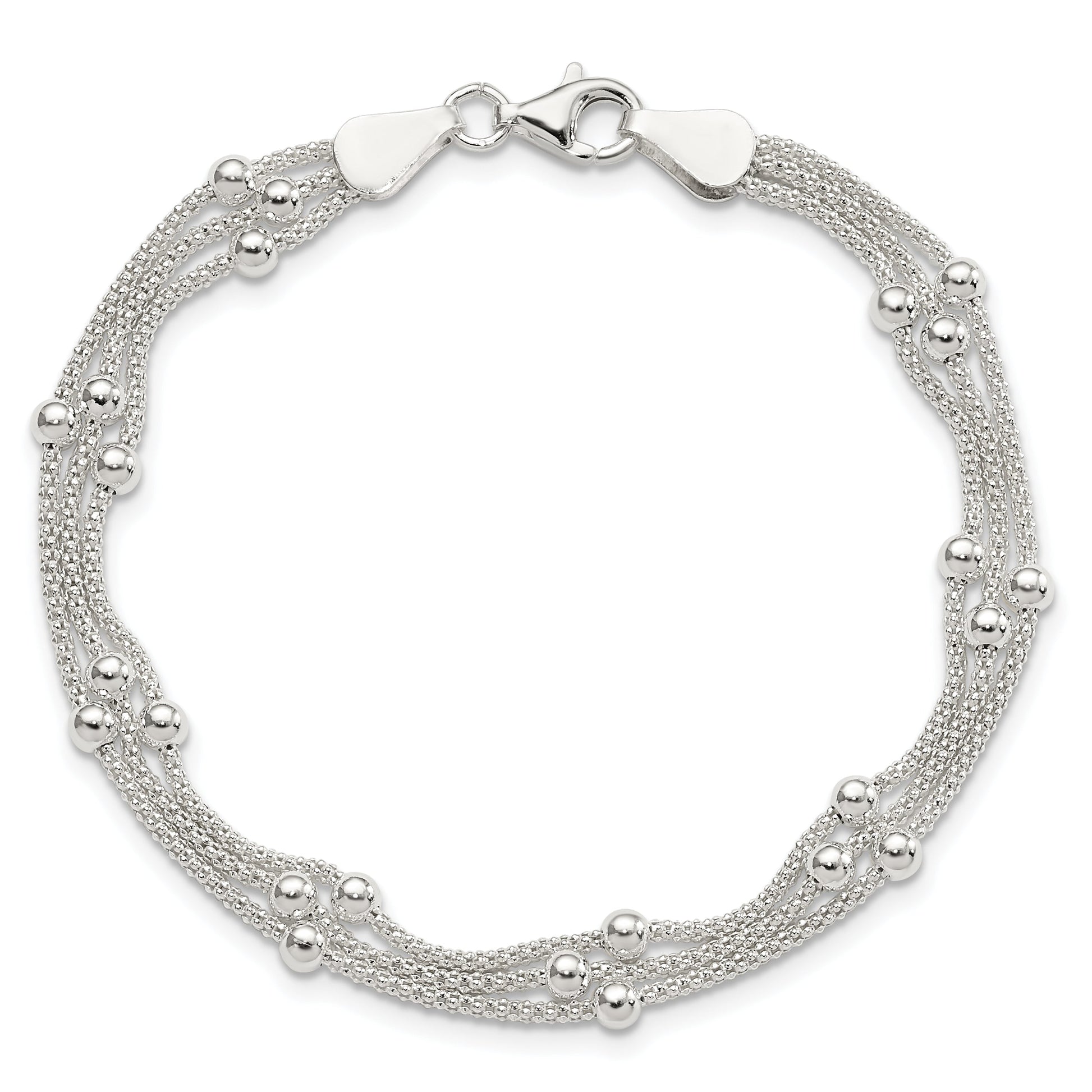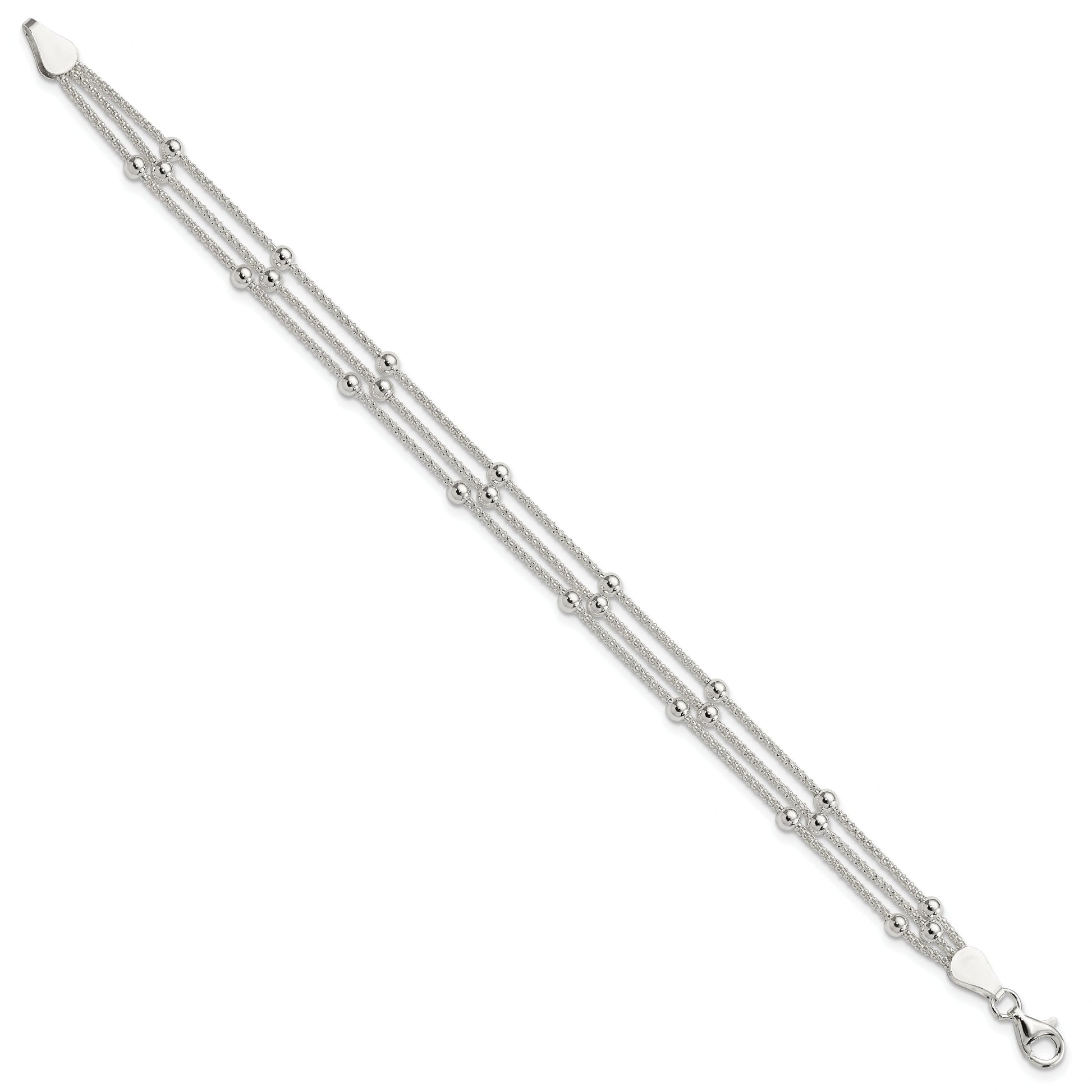 The 7-Inch Sterling Silver Polished Beaded 3-Strand Bracelet dazzles with elegance. Made from 925 sterling silver, this bracelet features a trio of beaded strands for a stylish statement. Each strand boasts polished beads, reflecting beauty with every move. At 7 inches long and 6 mm wide, it offers a perfect fit for any wrist. The piece is secured with a fancy lobster clasp, ensuring it stays in place. This versatile bracelet suits any ensemble for any occasion. Treat yourself or a loved one with this stunning 7-Inch Sterling Silver Polished Beaded 3-Strand Bracelet.