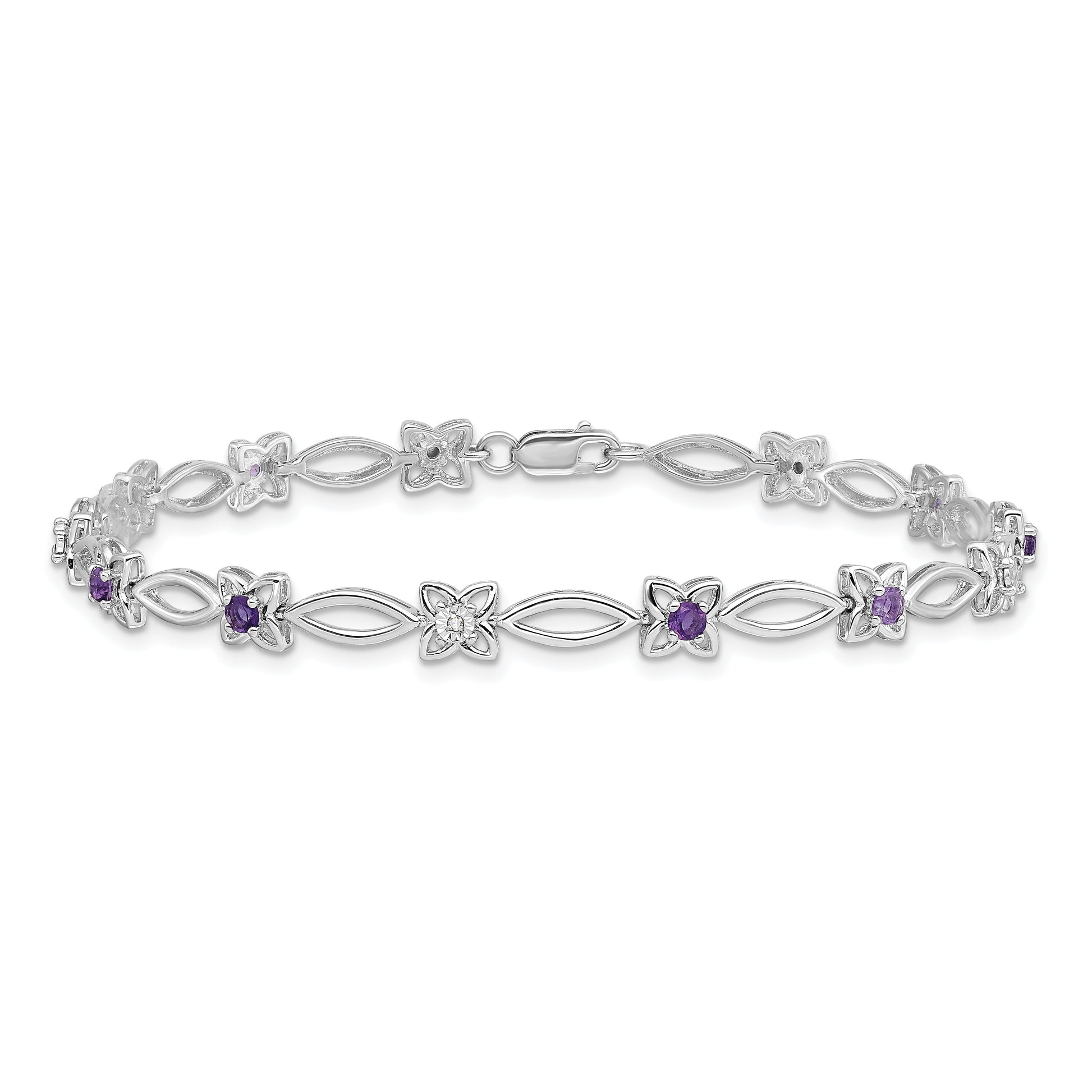 The 7 Inch Sterling Silver Rhodium-Plated Amethyst & Diamond Bracelet is a true masterpiece of elegance and charm. Crafted from polished sterling silver with a rhodium finish, this bracelet features eight dazzling purple amethysts and a sparkling diamond. The stones rest securely in prong settings, highlighting their natural beauty. Measuring 7 inches long and 5mm wide, it offers a solid feel with a sleek and polished look. Its lobster clasp ensures it stays in place all day. Celebrate February birthdays or just indulge in the allure of amethysts with this bracelet.