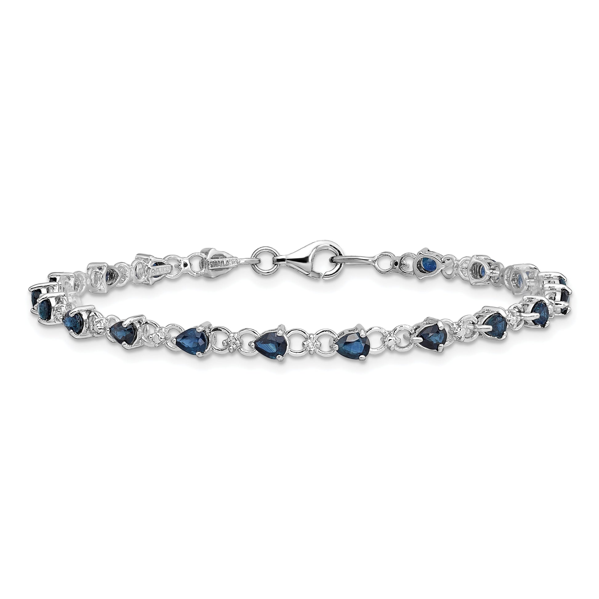 Introducing the 7 Inch Sterling Silver Rhodium-Plated Sapphire and Diamond Bracelet—a true showstopper. This dazzling piece flaunts 19 natural blue sapphires and 2 sparkling diamonds, all prong-set against a polished sterling silver base. The rhodium plating adds a lustrous finish and extra durability, ensuring this bracelet shines through any occasion. Measuring 7 inches in length and 3 mm in width, it sits perfectly on the wrist with a fancy lobster clasp for secure wear. Whether you're dressing up for a night out or adding flair to a casual ensemble, the 7 Inch Sterling Silver Rhodium-Plated Sapphire and Diamond Bracelet makes an unforgettable statement.