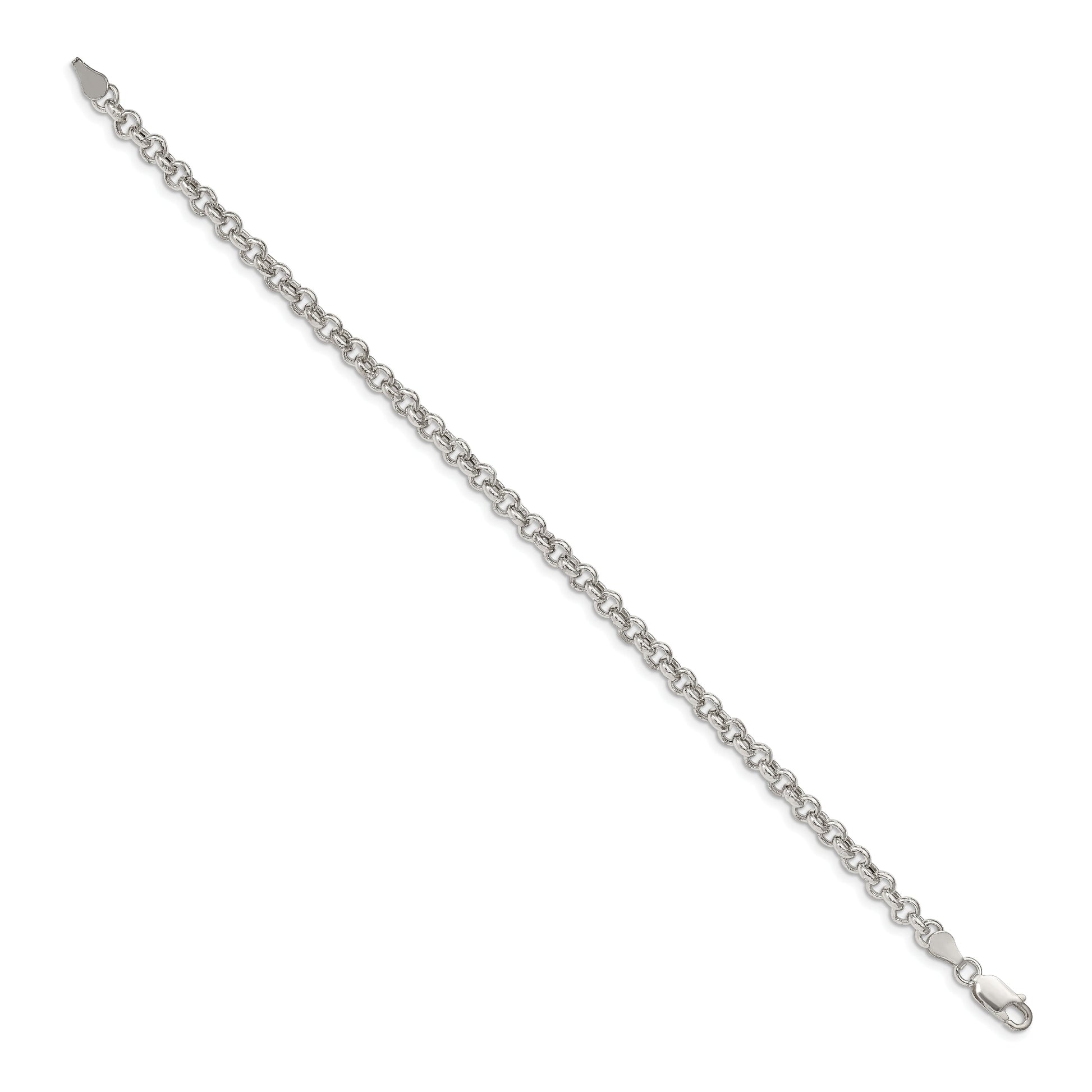 The 8 Inch Sterling Silver 4.25mm Semi-Solid Rolo Chain Bracelet is a refined piece of jewelry that adds elegance to any wrist. Crafted from 925 sterling silver, this bracelet showcases a polished finish that gleams beautifully. With a width of 4.25mm, its semi-solid rolo design provides both strength and comfort. The anti-tarnish coating ensures long-lasting shine, making it a dependable choice for everyday wear. Its secure lobster clasp keeps it firmly in place. This elegant women's bracelet is machine-made and sold individually. Add sophistication to your look with this stunning 8 Inch Sterling Silver 4.25mm Semi-Solid Rolo Chain Bracelet.