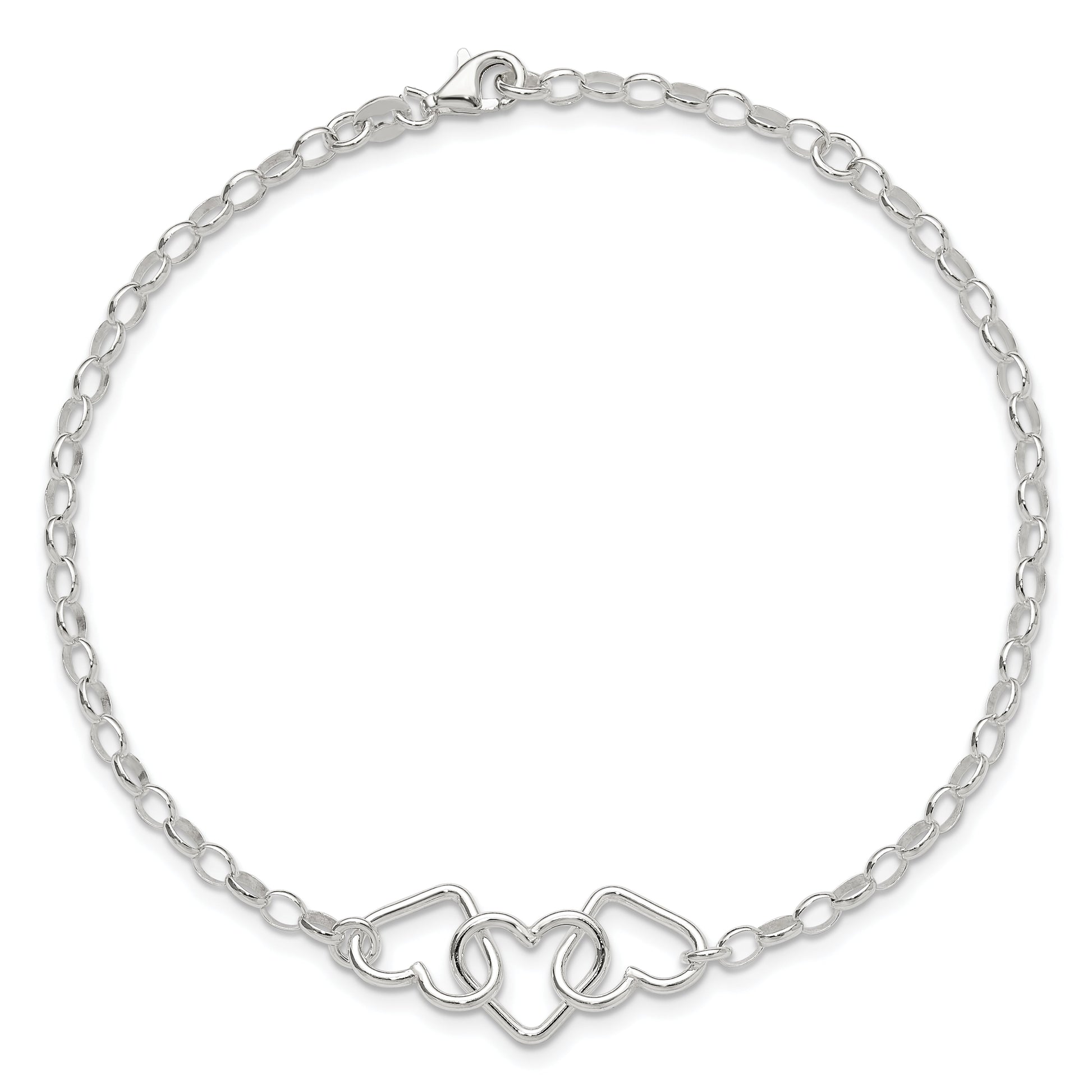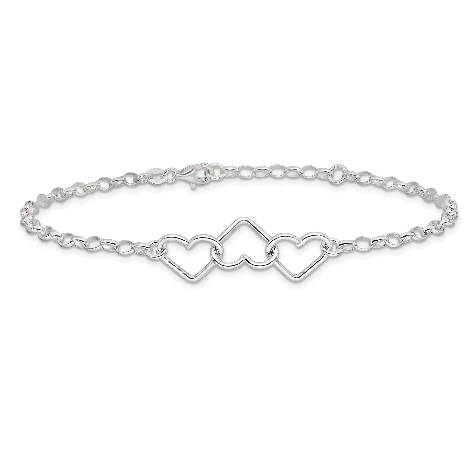 The 8-Inch Sterling Silver Interlocking Hearts Rolo Chain Anklet is a timeless piece for any jewelry collection. Crafted from genuine 925 sterling silver, this anklet features a polished finish for that brilliant shine. The design includes lovely interlocking hearts along its 8-inch rolo chain, which extends by another inch for a comfy fit. With a solid build and anti-tarnish coating, it promises lasting charm. The spring ring clasp ensures a secure hold for everyday wear. This anklet embodies elegance and grace, making it a must-have for those who cherish fine jewelry.