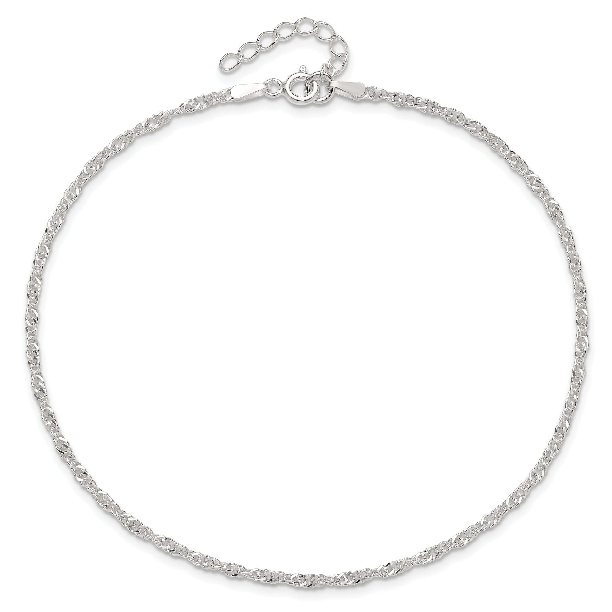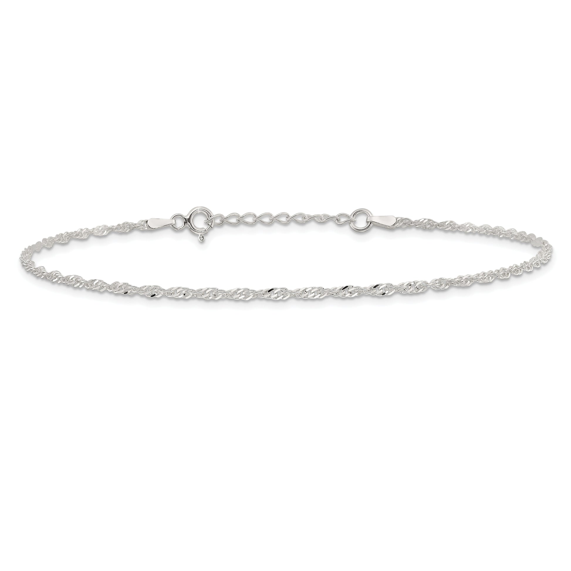 Enhance your style with the 9-Inch Sterling Silver Anklet from Singapore, complete with a 1-inch extender. Crafted from pure 925 sterling silver, this anklet gleams with a polished finish that catches the light with every step. Its 9-inch length, plus the extender, provides versatility for the perfect fit. The 2 mm width gives it a delicate yet sturdy presence, while the spring ring clasp ensures it stays secure. An anti-tarnish coating keeps it shiny, while its twisted texture adds a unique flair. Adorn your ankle with this stunning jewelry piece and embrace effortless elegance.