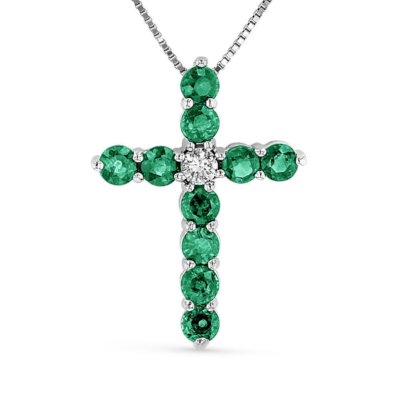 Emerald and 0.07 CT. Natural Diamond Cross Pendant in 14K White Gold