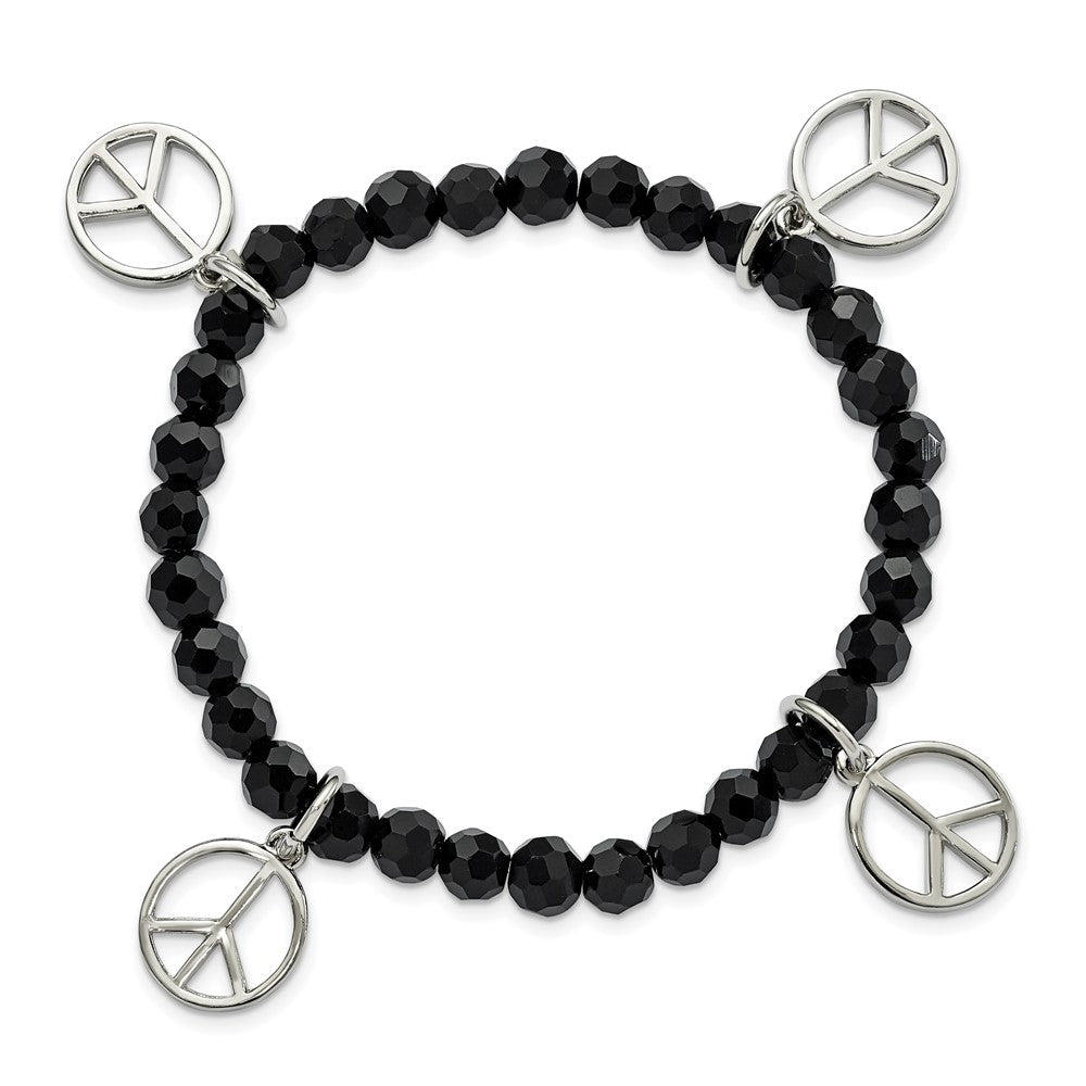 Introducing the Fashion 1928 Jewelry Silver-Tone Peace Charms on Jet Black Crystal Faceted Beaded Stretch Bracelet, a stunning piece designed to catch eyes. This bracelet showcases polished silver-tone peace charms, perfectly paired with jet black crystal beads. Measuring 6.25 mm in chain width and 24 mm in charm length, it offers an elegant yet edgy look. The bracelet's stretch design ensures a comfortable fit without any clasp, making it easy to slip on. Embrace both style and ease with the Fashion 1928 Jewelry Silver-Tone Peace Charms bracelet, a must-have for any jewelry lover.