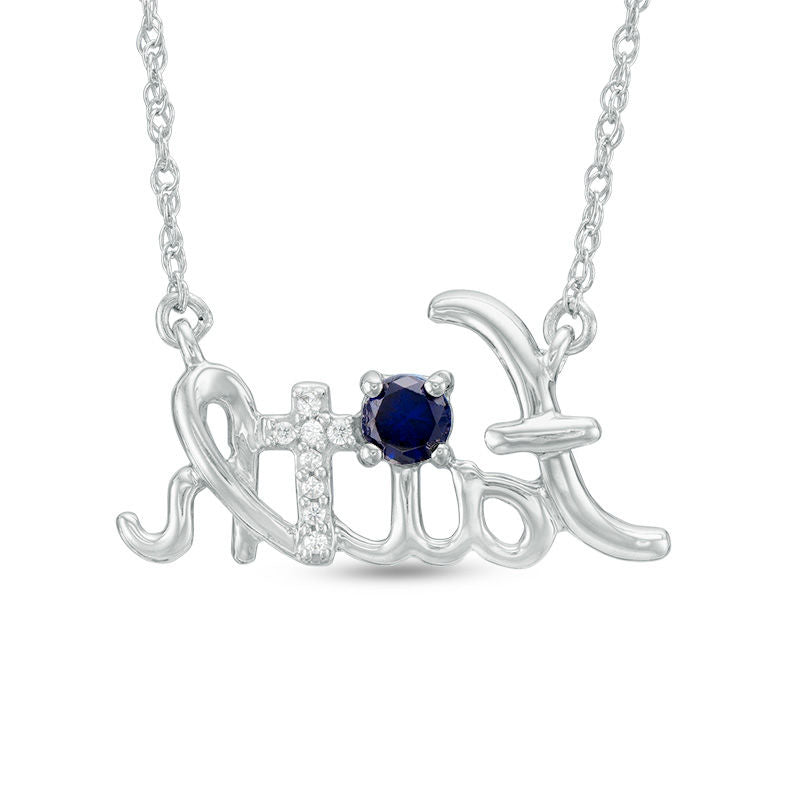 Lab-Created Blue Sapphire and Diamond Accent Cursive faith" Necklace in Sterling Silver"