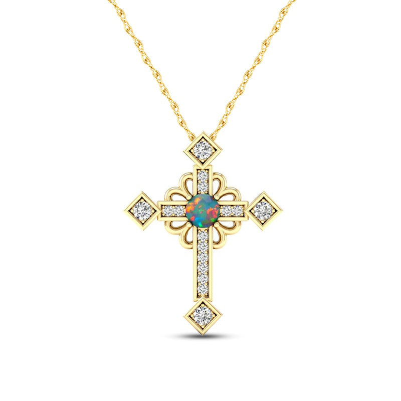 Lab-Created Opal and 0.05 CT. T.W. Diamond Gothic-Style Cross Pendant in 10K Yellow Gold