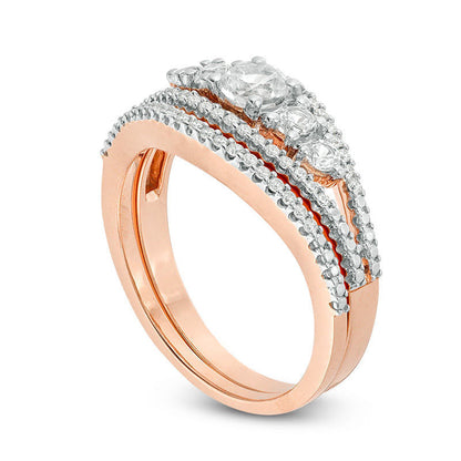 Lab-Created White Sapphire and 0.17 CT. T.W. Diamond Five Stone Bridal Engagement Ring Set in Solid 10K Rose Gold