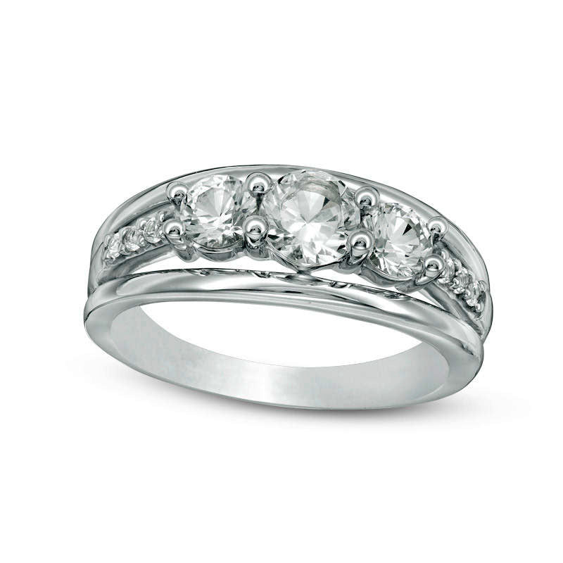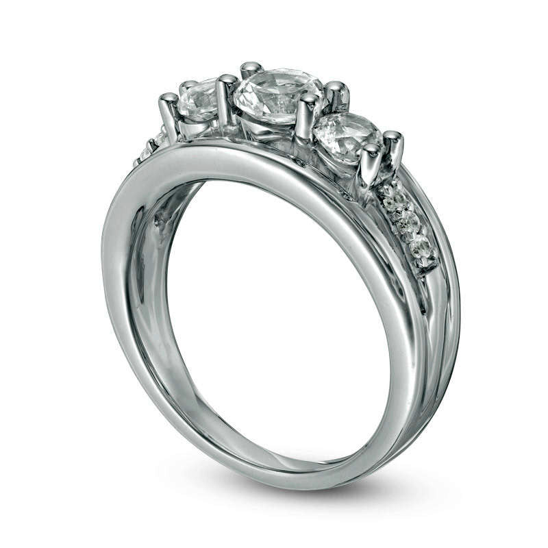 Lab-Created White Sapphire Three Stone Split Shank Engagement Ring in Sterling Silver