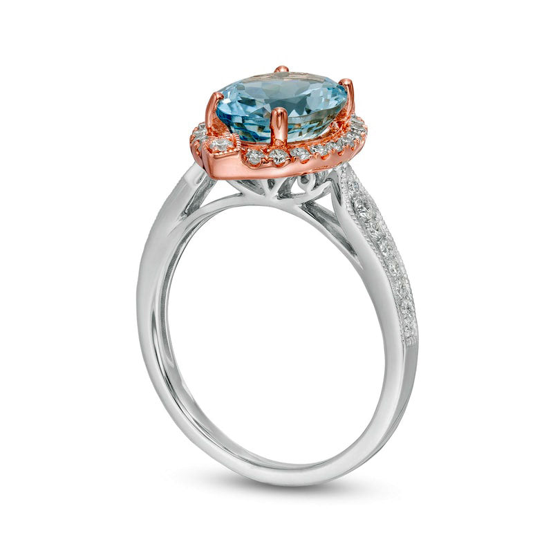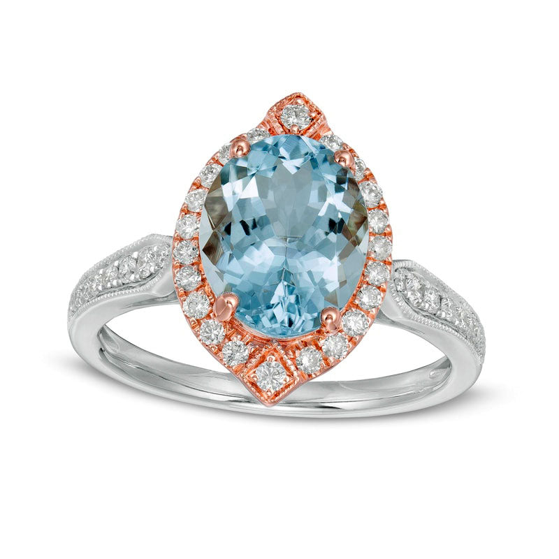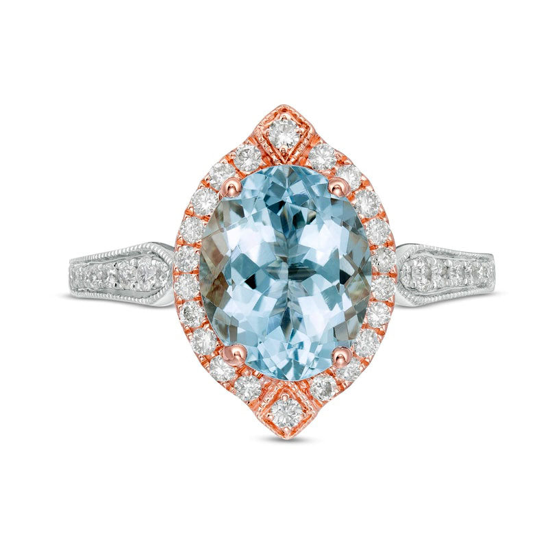 Oval Aquamarine and 0.33 CT. T.W. Natural Diamond Ornate Marquise Frame Double Row Art Deco Ring in Solid 14K Two-Tone Gold