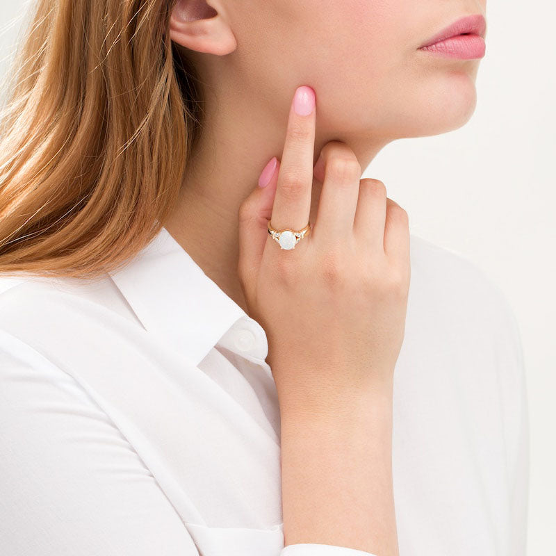 Oval Lab-Created Opal and Diamond Accent Leaf Split Shank Ring in Solid 10K Yellow Gold