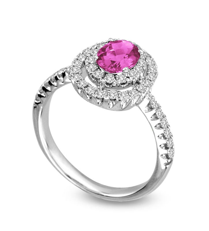 This 14K white gold ring with an oval pink sapphire and half a carat total weight of diamonds will take your loved one's breath away. The center stone, measuring 7.0 x 5.0mm, is surrounded by a double halo of sparkling diamonds. Even the shank boasts additional diamonds, ensuring that this ring is unforgettable. With its eye-catching design and dazzling brilliance, it's the perfect accessory for any occasion.