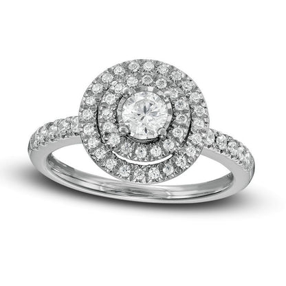 This stunning diamond engagement ring exudes sophistication and charm. Crafted in exquisite 10K white gold, this ring features a remarkable 1/4 ct. round diamond center stone. A dual halo frame of smaller round accent diamonds beautifully encircles the center stone, while additional diamonds gracefully adorn the slender shank. With a total diamond weight of 1/2 ct. t.w., this ring is a loving expression of commitment that shines with a polished finish. Please note that as this is a previously owned piece of jewellery, the ring you receive may have been resized in the past. Our pre-owned ring selection is offered in their current size and cannot be adjusted upon purchase. Because our pre-owned inventory is subject to change, we are unable to confirm or guarantee the exact size of any ring.