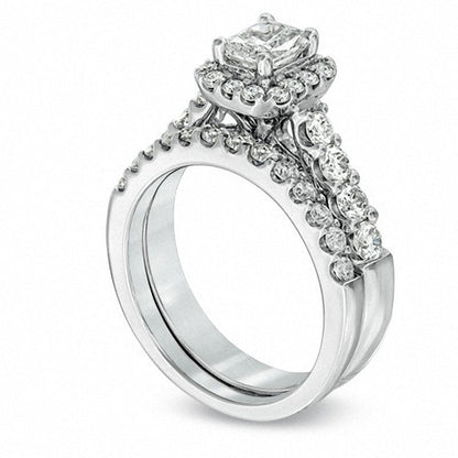 This breathtaking previously owned bridal set is crafted from 14K white gold, showcasing a stunning 3/4 ct. radiant-cut diamond surrounded by smaller round accent diamonds. The ring's shank also features additional round diamonds. The coordinating wedding band completes this magnificent set, with a total weight of 2 cts. t.w. of diamonds. Please note that pre-owned jewelry cannot be resized at purchase, and the size of the ring may vary.