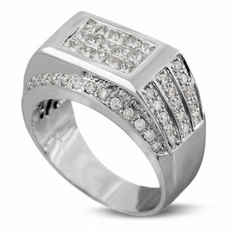 Looking for a bold and striking piece of jewelry that will make you stand out? Look no further than this previously owned men's diamond ring, crafted from 14K white gold and featuring an impressive total weight of 1-7/8 cts. The ring boasts a rectangular shape that's filled with princess-cut diamonds, while three rows of round, invisible-set diamonds gleam on the sides. Additional round diamonds curve around the front of the ring, adding a final touch of luxury. Please note that as this is a pre-owned item, it may have been previously sized and we cannot guarantee the size at purchase. Don't miss out on this opportunity to express your sophisticated style with masculine flair.