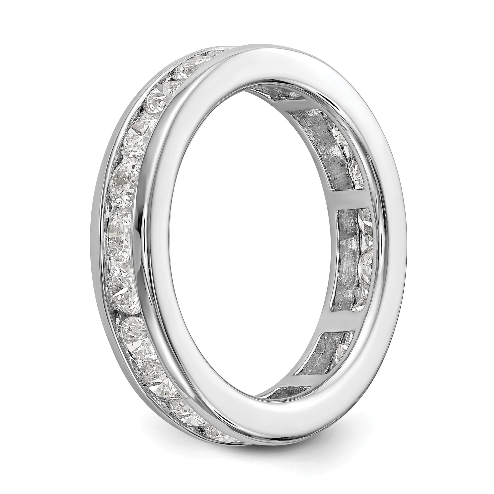 This is a beautiful 14k white gold wedding band ring with a 2ct channel set cubic zirconia. The ring is made of real gold and will not tarnish. It's perfect for everyday wear and for special occasions. The ring features 20 high-quality cubic zirconia polished by experienced jewelers. If you prefer, natural diamonds are available for additional cost. This ring makes a great gift for birthdays, anniversaries, and other special occasions. It comes with a 30-day money-back guarantee and is shipped in a gift box. The ring cannot be resized but is complete with all 20 stones.