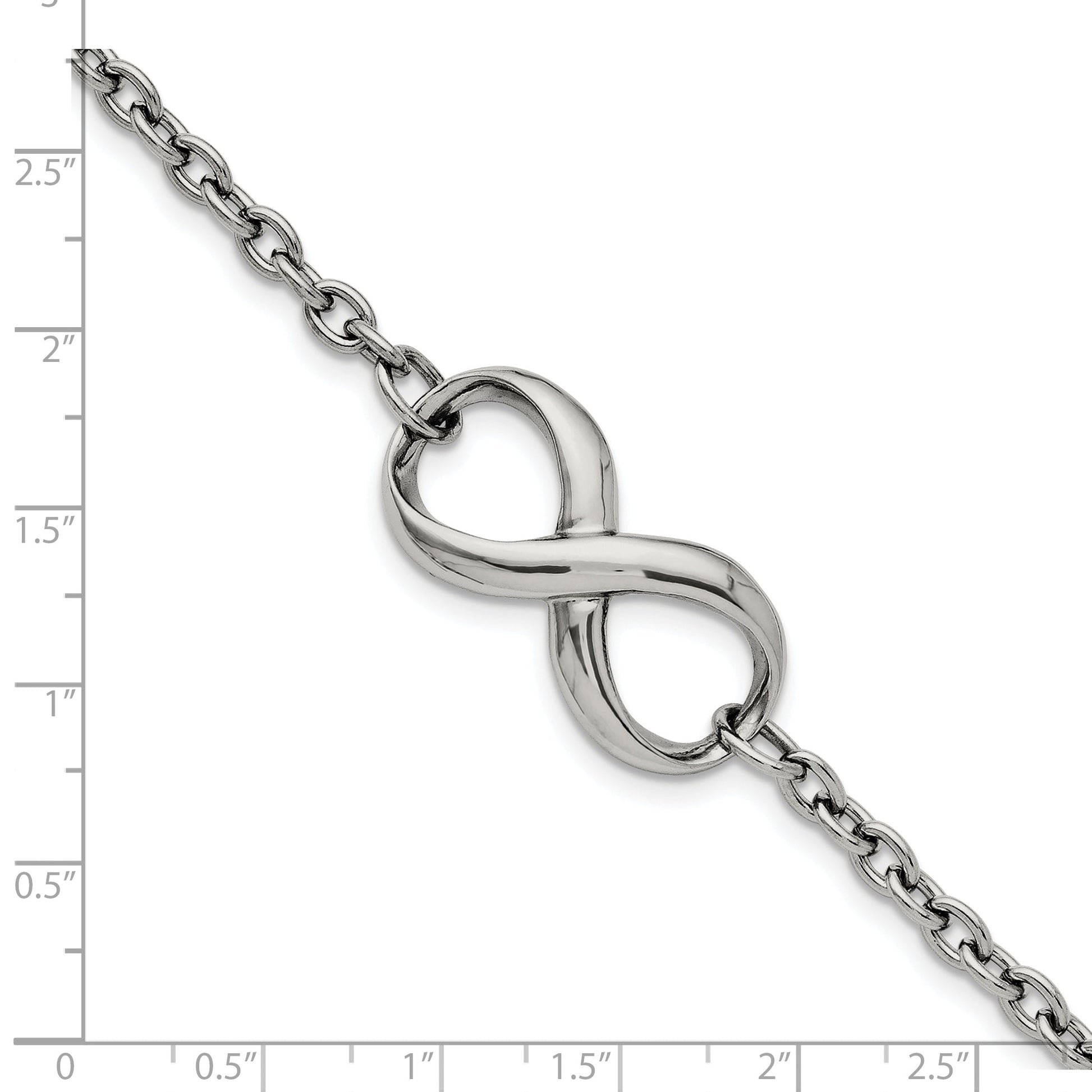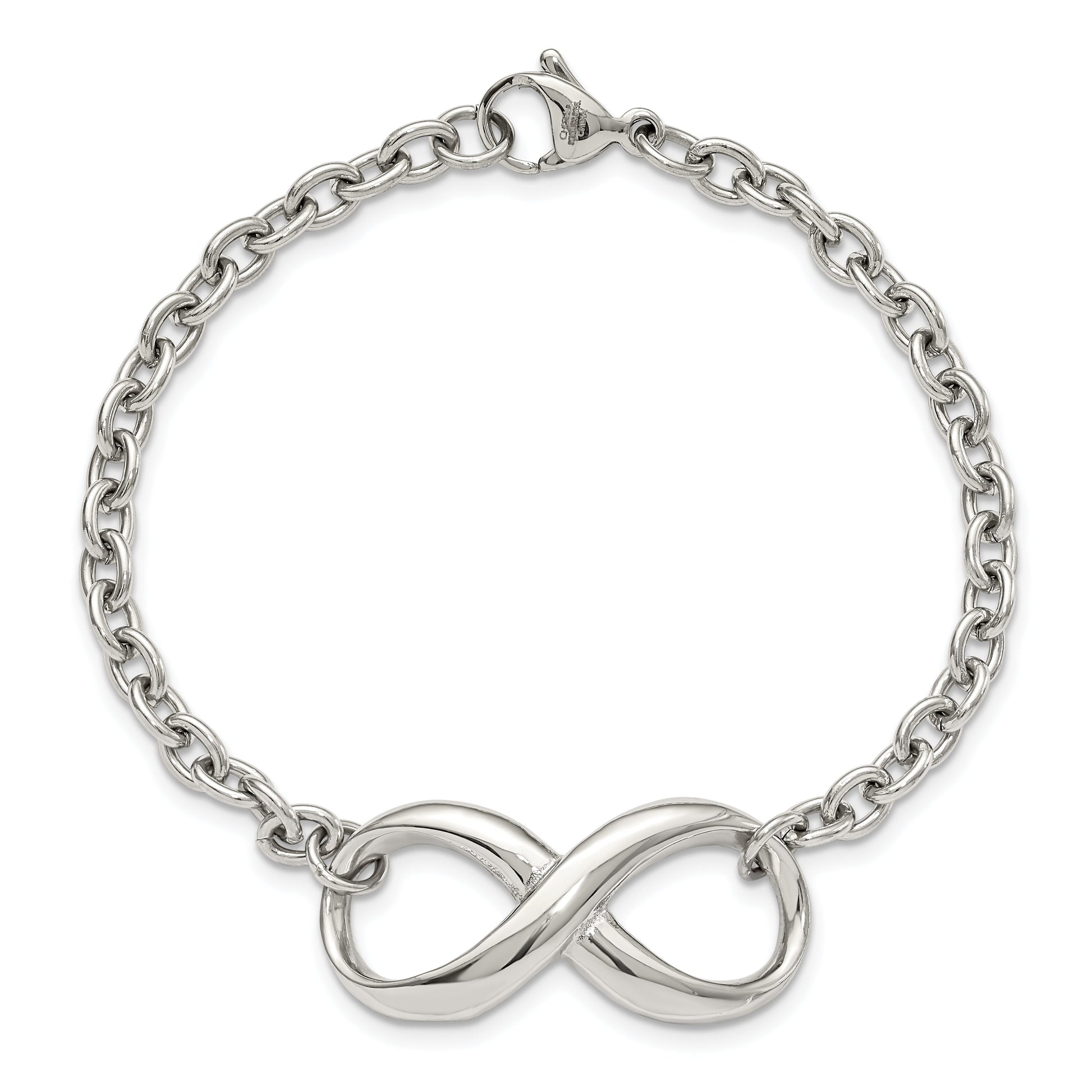 The Stainless Steel Chisel Polished Infinity Symbol Bracelet is a stylish accessory that adds elegance to any outfit. Crafted from durable stainless steel, this bracelet features a sleek, polished finish. The infinity symbol charm, measuring 16mm by 35mm, adds a timeless touch to its design. Its 7.5-inch cable chain, with a 4mm width, wraps comfortably around the wrist, secured by a fancy lobster clasp. Perfect as a gift, this bracelet comes in a classy box, ready to dazzle any recipient. The Stainless Steel Chisel Polished Infinity Symbol Bracelet is a must-have for those who love modern and polished designs.