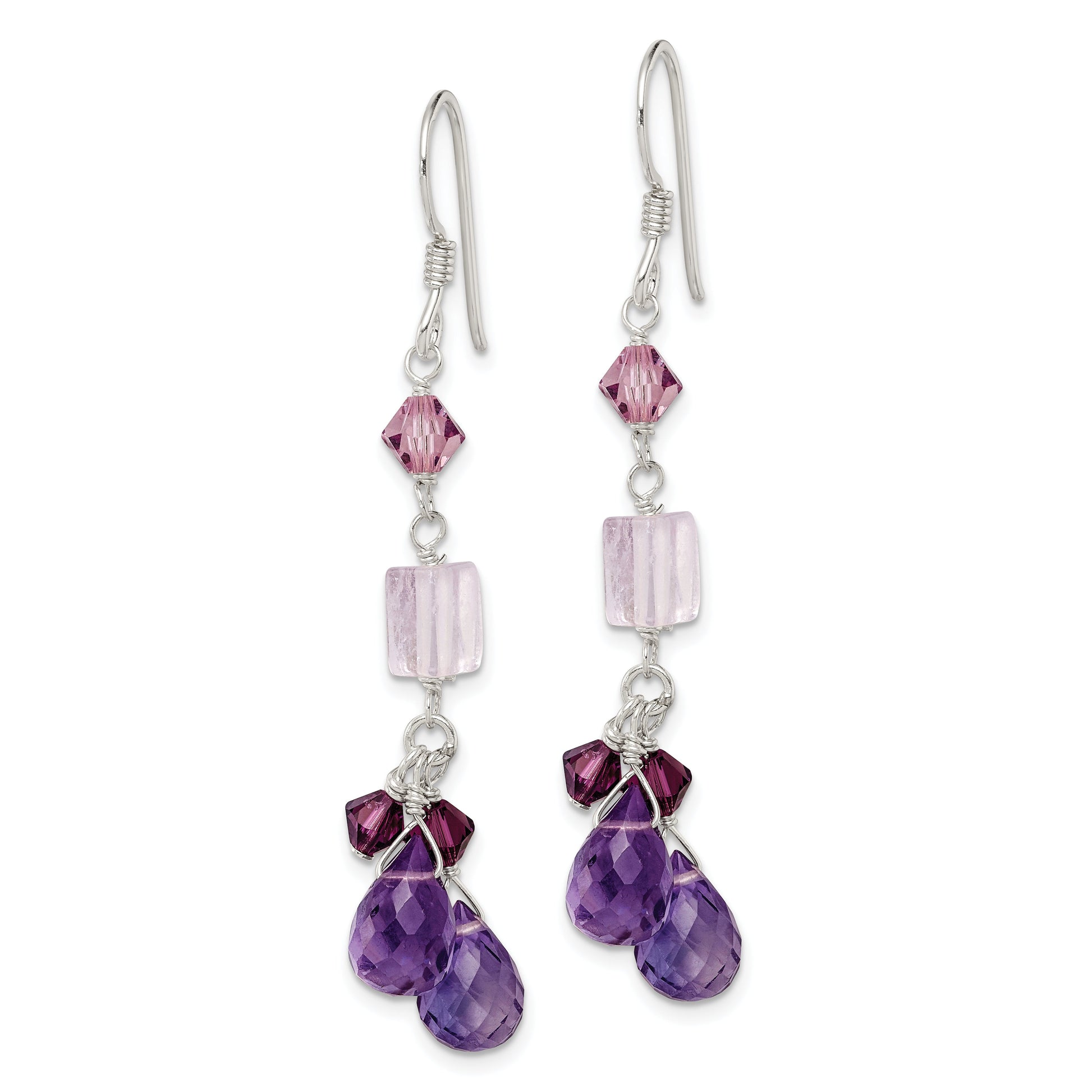 Elevate your style with these Sterling Silver Polished Amethyst, Lavender Quartz, and Crystal Dangle Earrings. Crafted from genuine 925 sterling silver, these earrings shine with a polished finish. The deep purple hues of natural amethyst blend beautifully with the soft tones of lavender quartz and sparkling crystals, creating an elegant look. Measuring 51 mm in length and 7 mm in width, these stunning earrings are designed for women and feature a secure French wire closure. Each gem is carefully heated to enhance its natural beauty. The Sterling Silver Polished Amethyst, Lavender Quartz & Crystal Dangle Earrings are perfect for any occasion, adding a touch of luxury to your ensemble.
