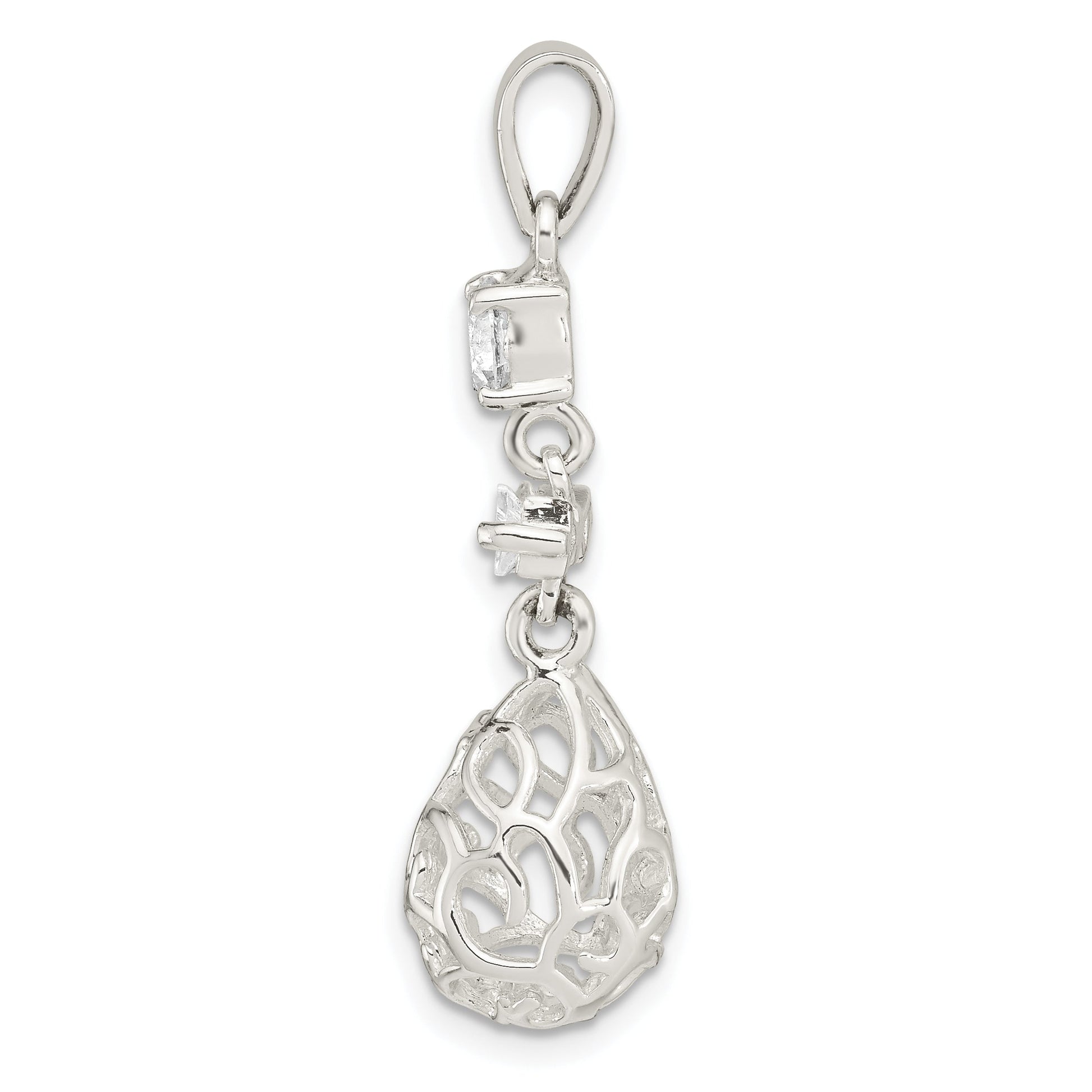 The Sterling Silver Polished CZ Teardrop Dangle Pendant makes an elegant statement. Crafted from 925 sterling silver, this pendant shines with a sleek, polished finish. The centerpiece features a brilliant white cubic zirconia, flanked by two trillion-cut stones for added sparkle. With a length of 36.1mm, this dainty piece complements any outfit, making it a versatile treasure. The teardrop charm, measuring 30mm, looks stunning suspended from its 4.31mm bail. This piece is perfect for a night out or a special gift. The Sterling Silver Polished CZ Teardrop Dangle Pendant promises timeless elegance.