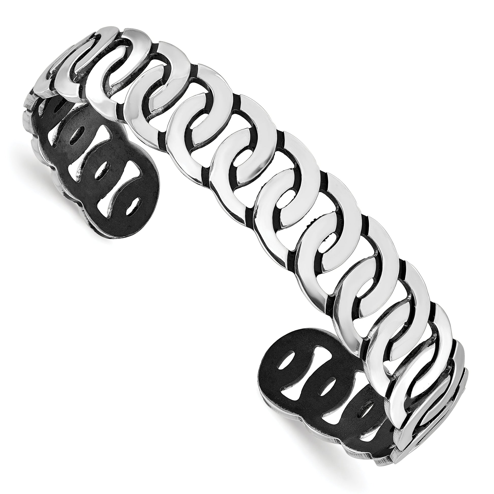 The Sterling Silver Rh-Plated Antiqued Burnished Polished Cuff Bangle is a must-have for jewelry lovers. Crafted from 925 sterling silver, this bangle features a durable rhodium finish that resists tarnish...