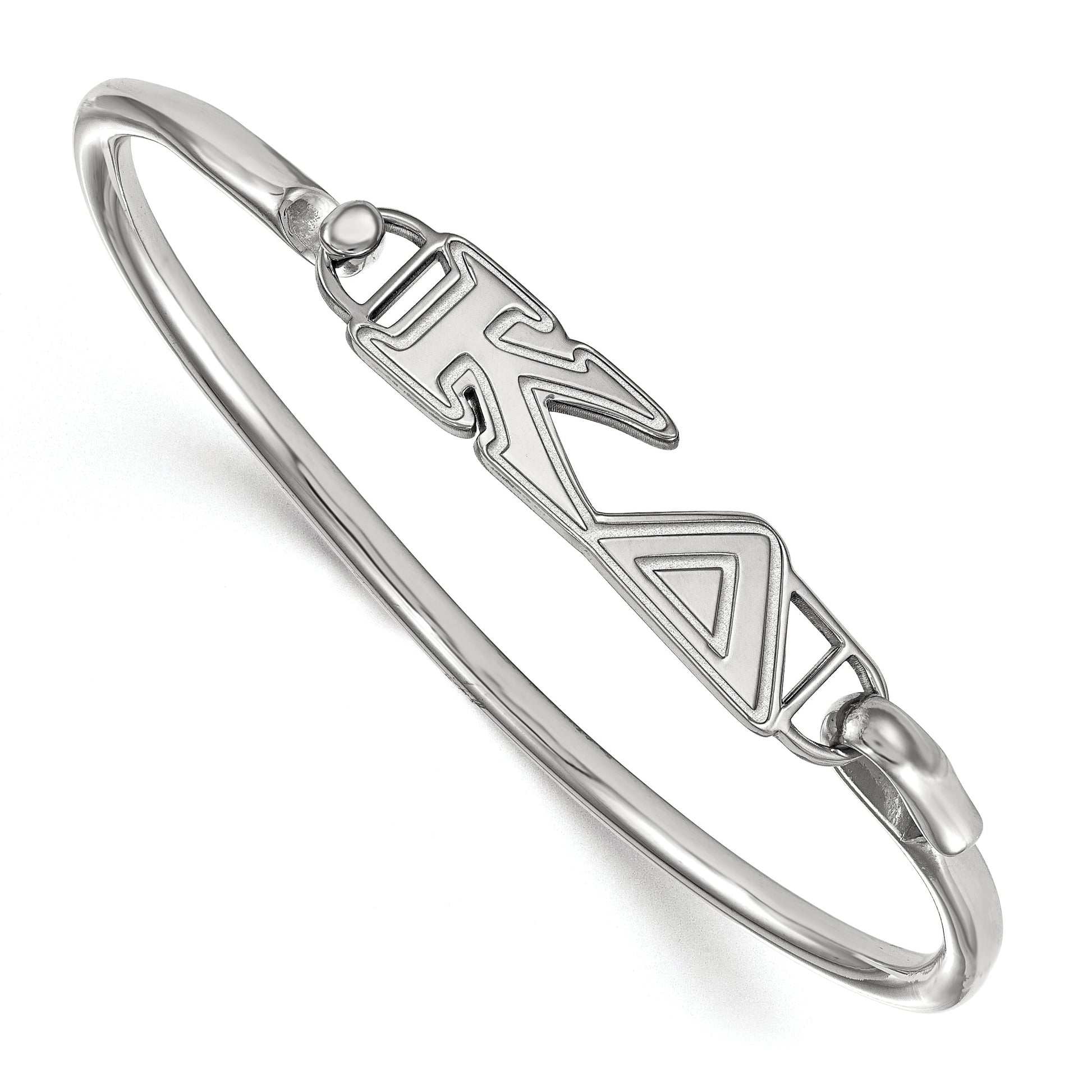 The Sterling Silver Rh-Plated Logoart Kappa Delta Small Hook and Clasp Bangle offers a sleek, stylish look for fans of Greek life. Made from pure sterling silver with a shiny rhodium finish, it measures 7 inches long and 3 mm wide, fitting comfortably on your wrist. Its small charm, engraved with the Kappa Delta logo, adds a subtle touch of pride. The hook clasp makes it easy to put on and take off, while the laser-cut design ensures durability. Show off your Kappa Delta spirit with this elegant, high-quality bracelet from Logoart LLC.