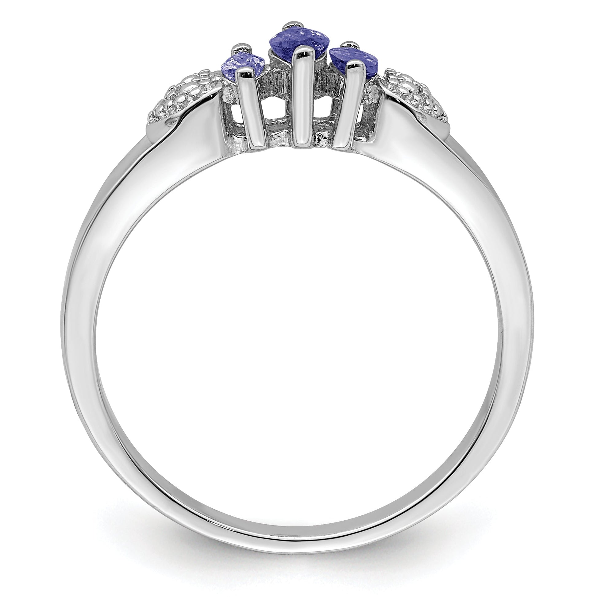 Discover the elegance of the Sterling Silver Rhodium 3 Stone Tanzanite And Diamond Ring, a stunning piece designed for women who love a touch of sparkle. This ring features two vibrant blue marquise tanzanite stones and a tiny, radiant diamond, all set in polished sterling silver with a sleek rhodium finish. The stones are securely prong-set, giving the ring a classic look. Its tapered band enhances comfort and style, making it perfect for everyday wear or special occasions. The Sterling Silver Rhodium 3 Stone Tanzanite And Diamond Ring is a true statement piece that blends natural beauty with timeless design.