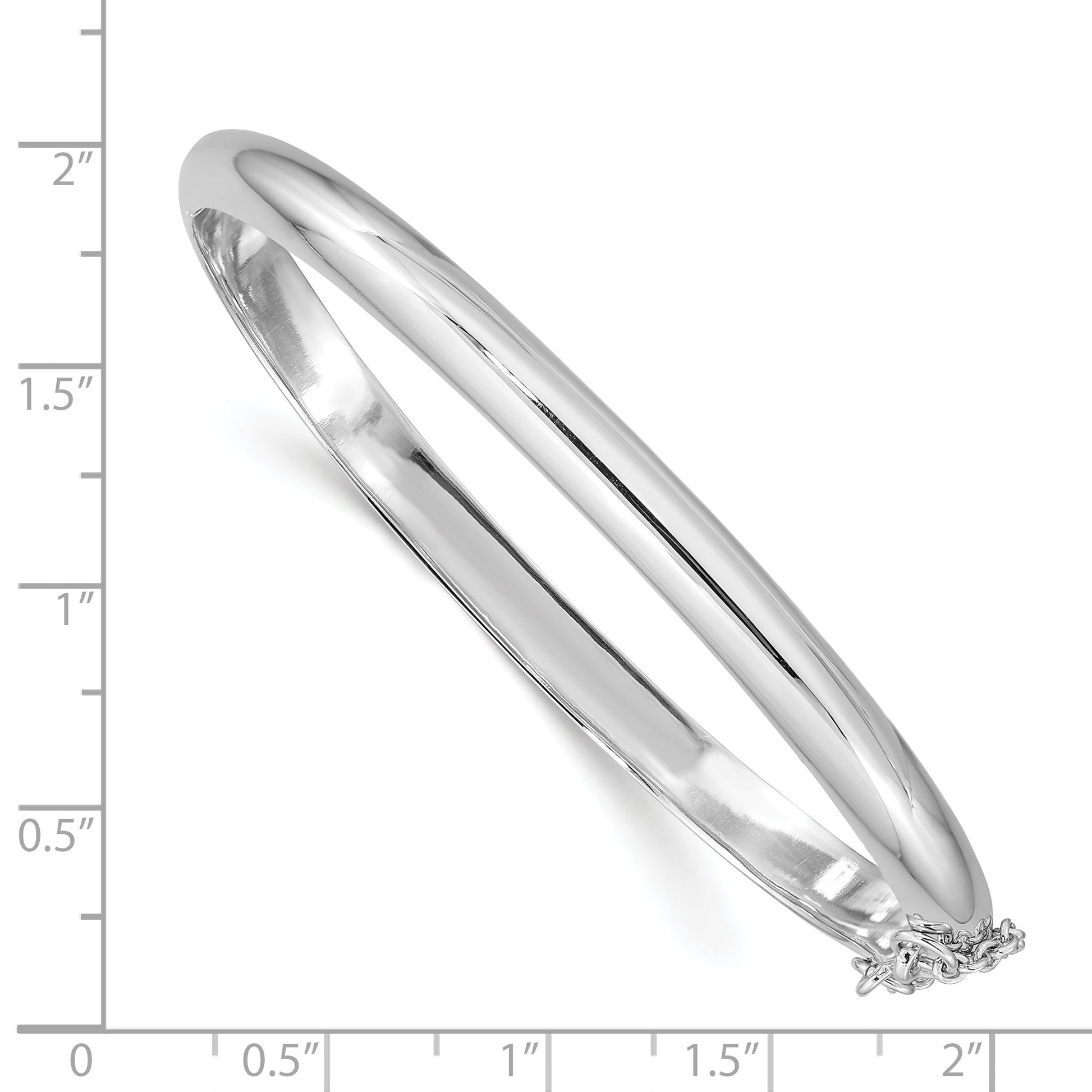 The Sterling Silver Rhodium-Plated 5mm Hinged Bangle radiates understated elegance. Made of 925 sterling silver, this polished beauty spans 7.25 inches and is coated in a sleek rhodium finish. Its chain adds refined charm, while the hinged design offers a snug fit paired with a reliable box catch clasp. Ideal for women who appreciate timeless jewelry, the bangle's white silver tone is enhanced by a subtle safety clasp for added assurance. Enjoy the graceful touch this lightweight, hollow bangle brings to your everyday style. The Sterling Silver Rhodium-Plated 5mm Hinged Bangle remains a must-have accessory in any collection.