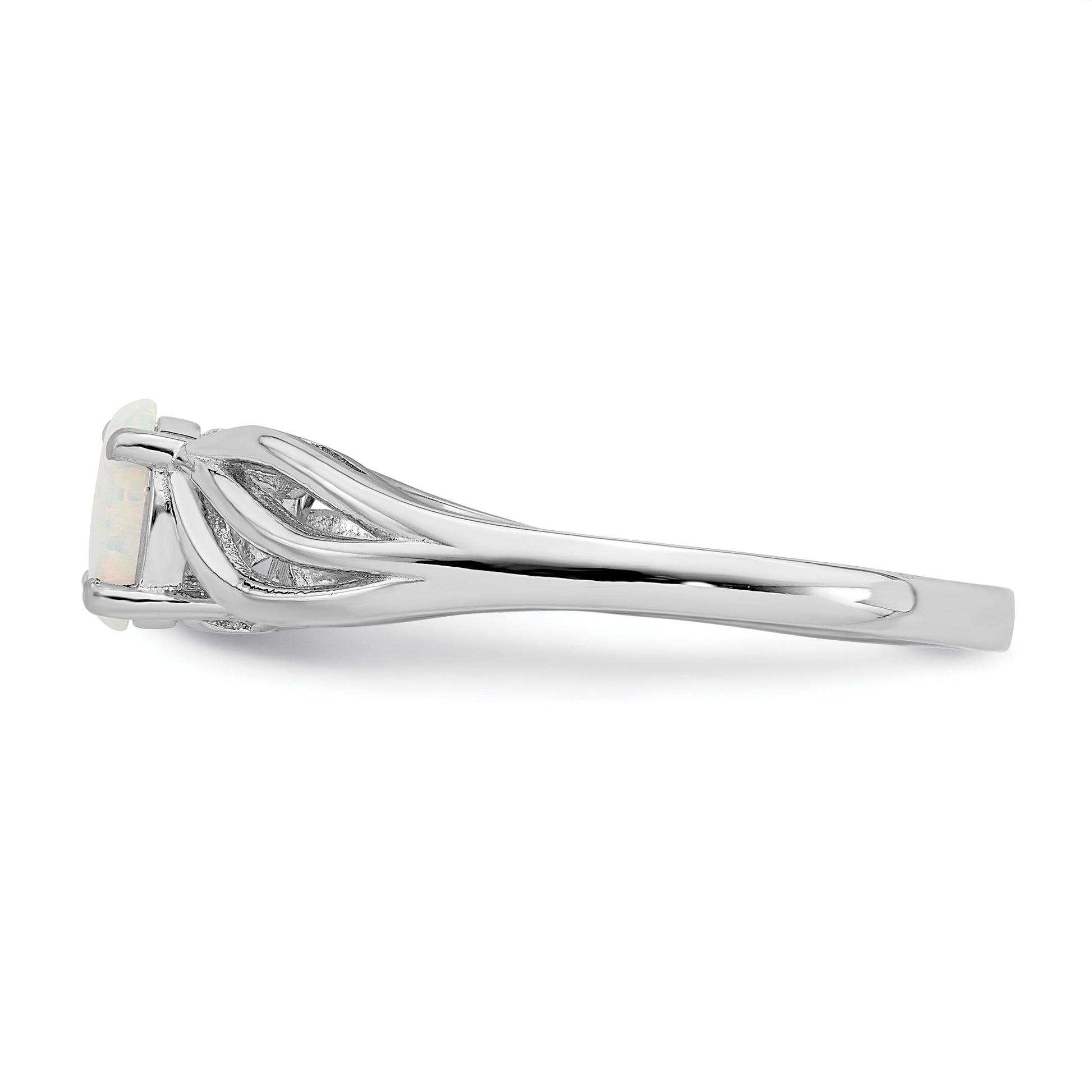 Introduce an elegant touch to your collection with the Sterling Silver Rhodium-Plated Created Opal Ring. This ring boasts a stunning lab-created opal, shimmering with a unique phenomena in its oval 6 x 4 mm setting. The opal's unique color play will catch every eye. Crafted from 925 sterling silver and rhodium-plated for lasting shine, this band stands solid at 2 mm in width, ensuring comfort and style. The prong setting elevates the 0.28 ct gemstone, making it the highlight. Perfect for those born in October, the Sterling Silver Rhodium-Plated Created Opal Ring is a must-have.