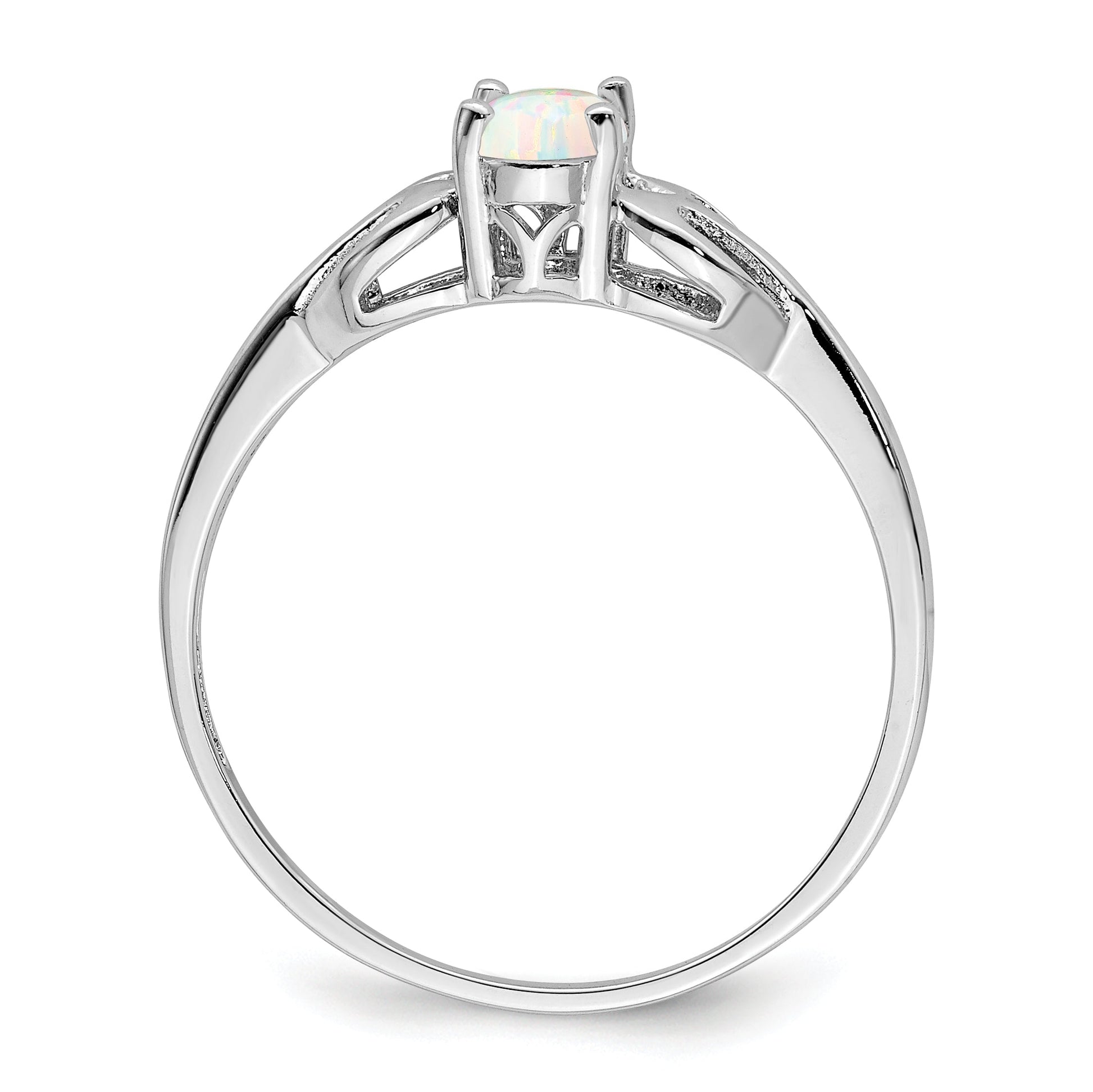 The Sterling Silver Rhodium-Plated Created Opal Ring is a stunning piece for any jewelry collection. Crafted with 925 sterling silver and plated with rhodium, this ring offers durability and a lustrous finish. Featuring a 6 x 4 mm oval lab-created opal, it captures the eye with its vibrant phenomena color. The opal, set in a secure prong setting, weighs 0.31 carats, ensuring a striking centerpiece. Its sleek 2 mm band elegantly complements the stone's brilliance. Celebrate October birthdays or simply treat yourself with this captivating Sterling Silver Rhodium-Plated Created Opal Ring.