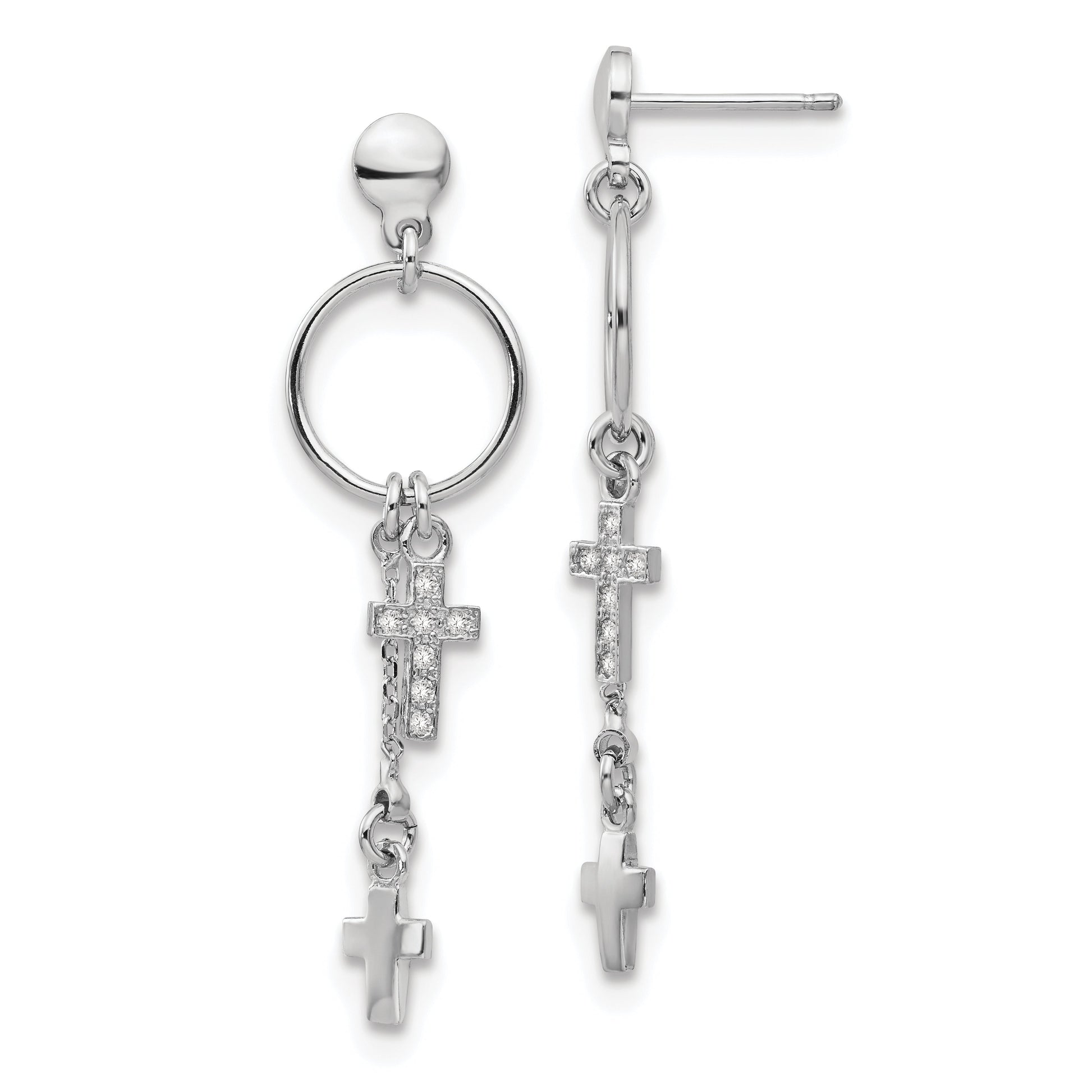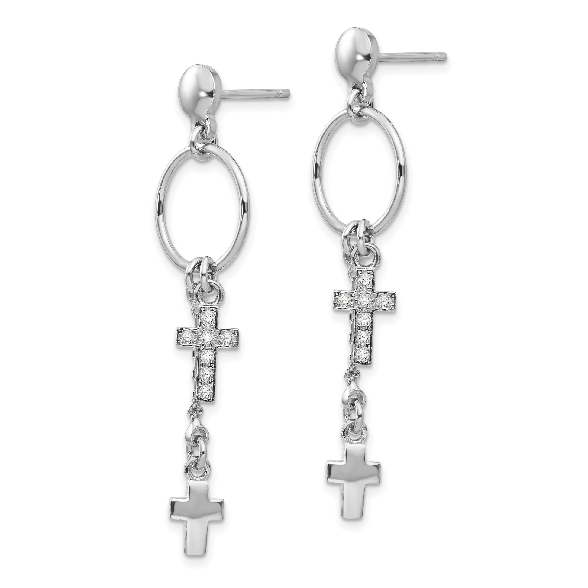 The Sterling Silver Rhodium-Plated CZ Cross Dangle Earrings are a stunning addition to any jewelry collection. Crafted from 925 sterling silver, these earrings boast a polished finish with rhodium plating, offering a lustrous silver tone. Each earring features 14 round cubic zirconia stones that dazzle with their brilliant white shine. The low-profile setting ensures a secure hold for the stones, and the post and push-back closure offers ease and comfort. The cross dangle design adds a touch of elegance, making these earrings perfect for any occasion. Shop confidently with a lifetime guarantee for these exquisite Sterling Silver Rhodium-Plated CZ Cross Dangle Earrings.