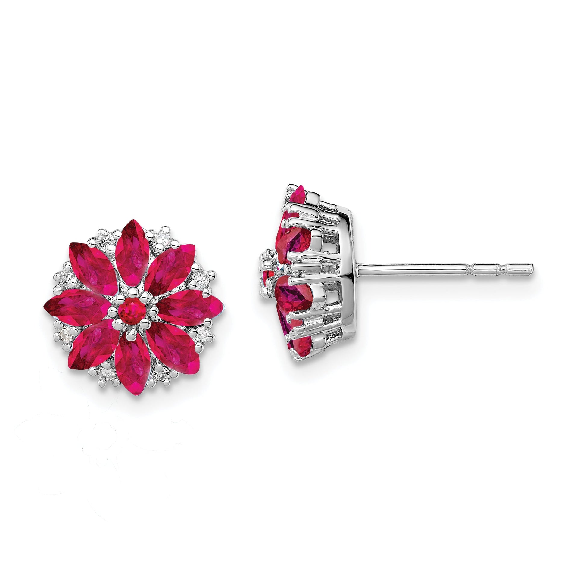 Discover the allure of the Sterling Silver Rhodium-Plated Diamond & Ruby Earrings—crafted to add a splash of elegance to any attire. These stunning earrings boast vibrant red rubies and sparkling white diamonds set in polished sterling silver. The rhodium plating amplifies their luster and adds durability. Each earring features 2 round rubies and 16 round diamonds, with marquise-shaped rubies adding a unique twist. The post and push-back closure ensures they stay secure through every occasion. Perfect for July birthdays, the Sterling Silver Rhodium-Plated Diamond & Ruby Earrings are the ideal addition to your collection.