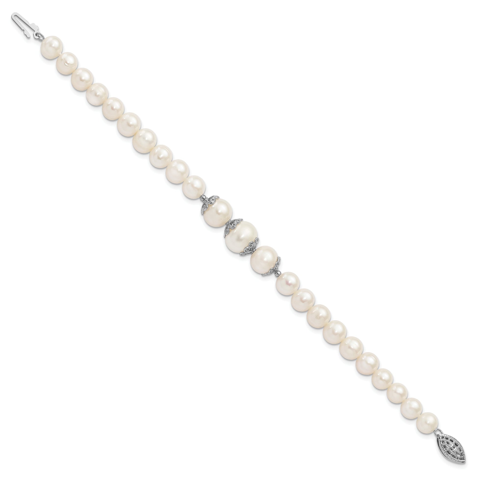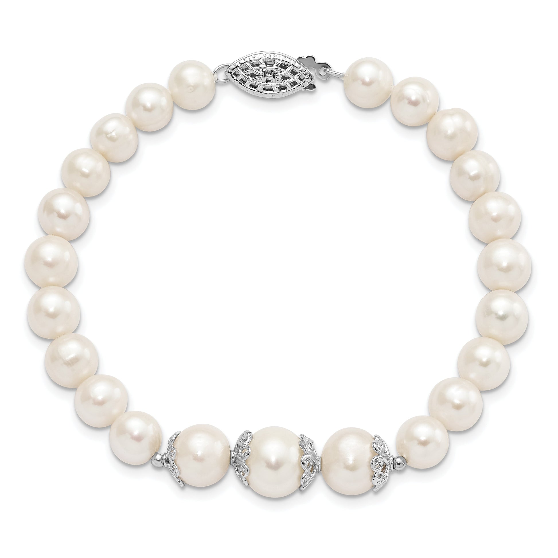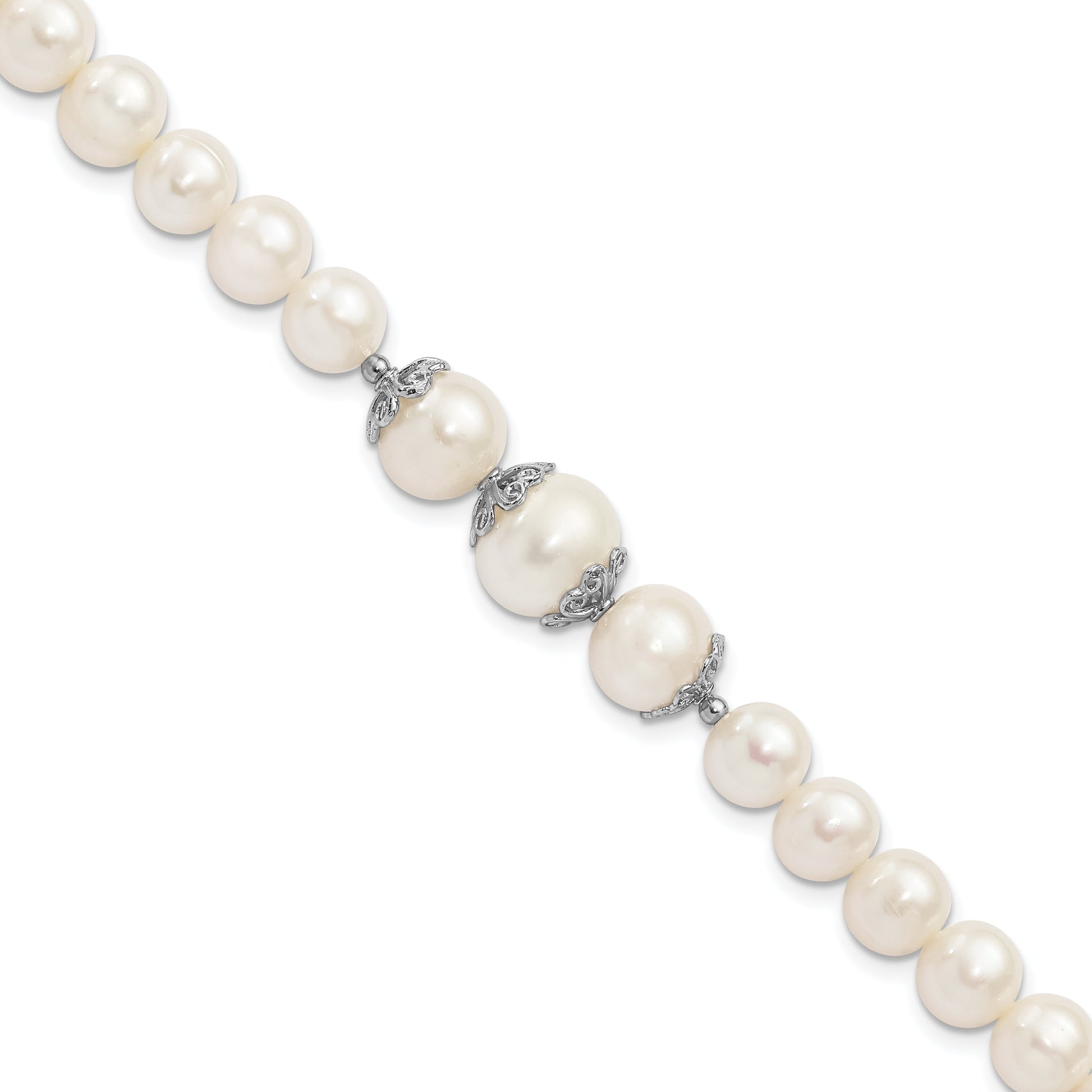 The Sterling Silver Rhodium-Plated Fancy Filigree Spacers and 7-10mm White Freshwater Cultured Pearl 7 Inch Bracelet combines timeless elegance with modern flair. Crafted from high-quality 925 sterling silver, each bracelet boasts intricate rhodium-plated filigree work. The lustrous, near-round pearls range from 7 to 10mm, adding a sophisticated touch to any outfit. These cultured freshwater pearls, skillfully bleached for perfection, exude a classic white glow. Perfectly sized at 7 inches, this jewelry piece features a secure pearl clasp, ensuring durability without sacrificing beauty. Elevate your style with this chic Sterling Silver Rhodium-Plated Pearl Bracelet, designed for women who appreciate luxury.