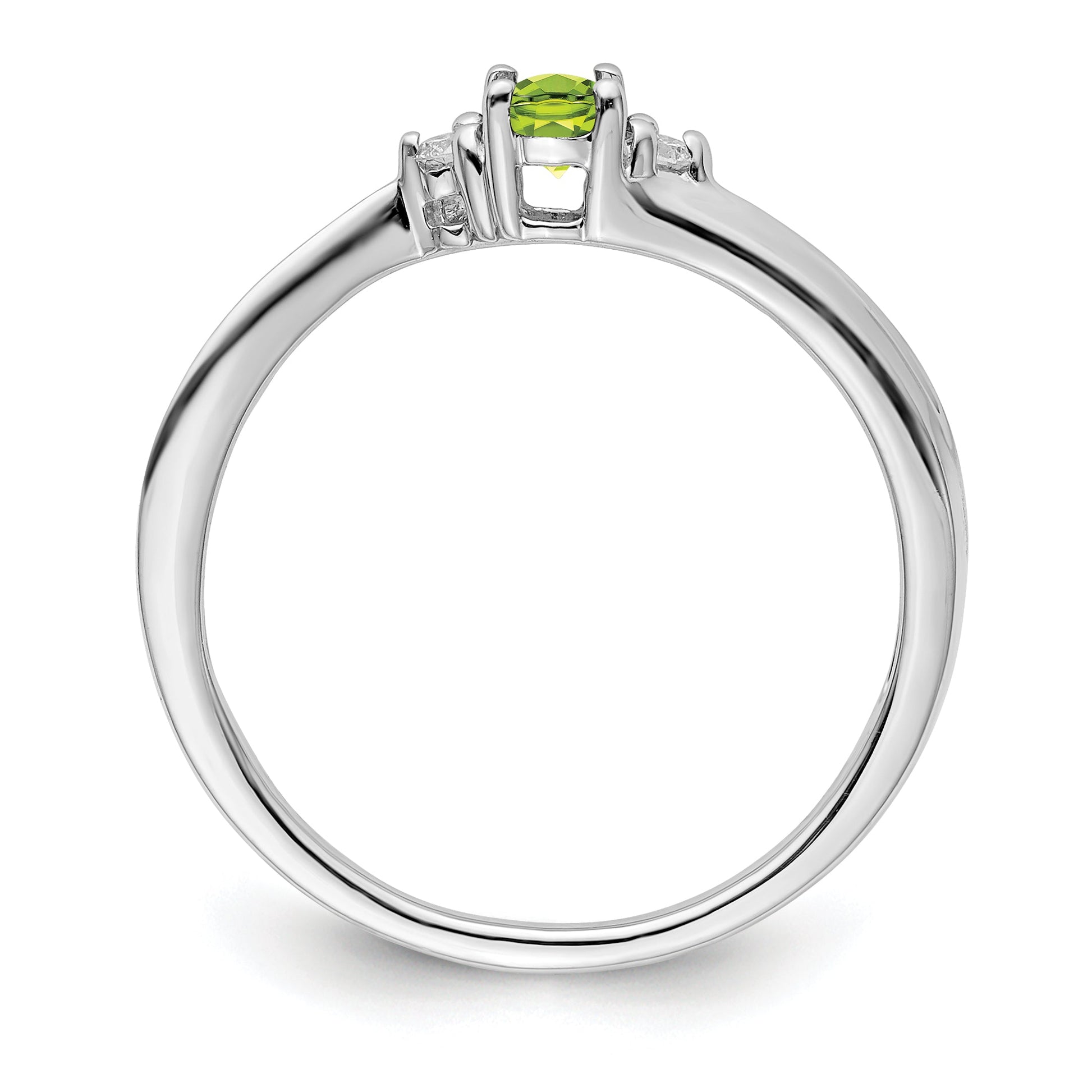 The Sterling Silver Rhodium-Plated Peridot & Diamond Birthstone Ring brings elegance to your fingers. A natural green peridot, set in a secure 4-prong hold, takes center stage. On each side, two dazzling round diamonds sparkle. Crafted from 925 sterling silver, the band offers a smooth polished finish, tapered between 1.5 and 2.2 mm, with a radiant rhodium plating. The oval peridot measures 5 x 3 mm and weighs 0.25 ct, while the diamonds weigh 0.02 ct. Celebrate August birthdays with this timeless piece. The Sterling Silver Rhodium-Plated Peridot & Diamond Birthstone Ring makes each moment shine.