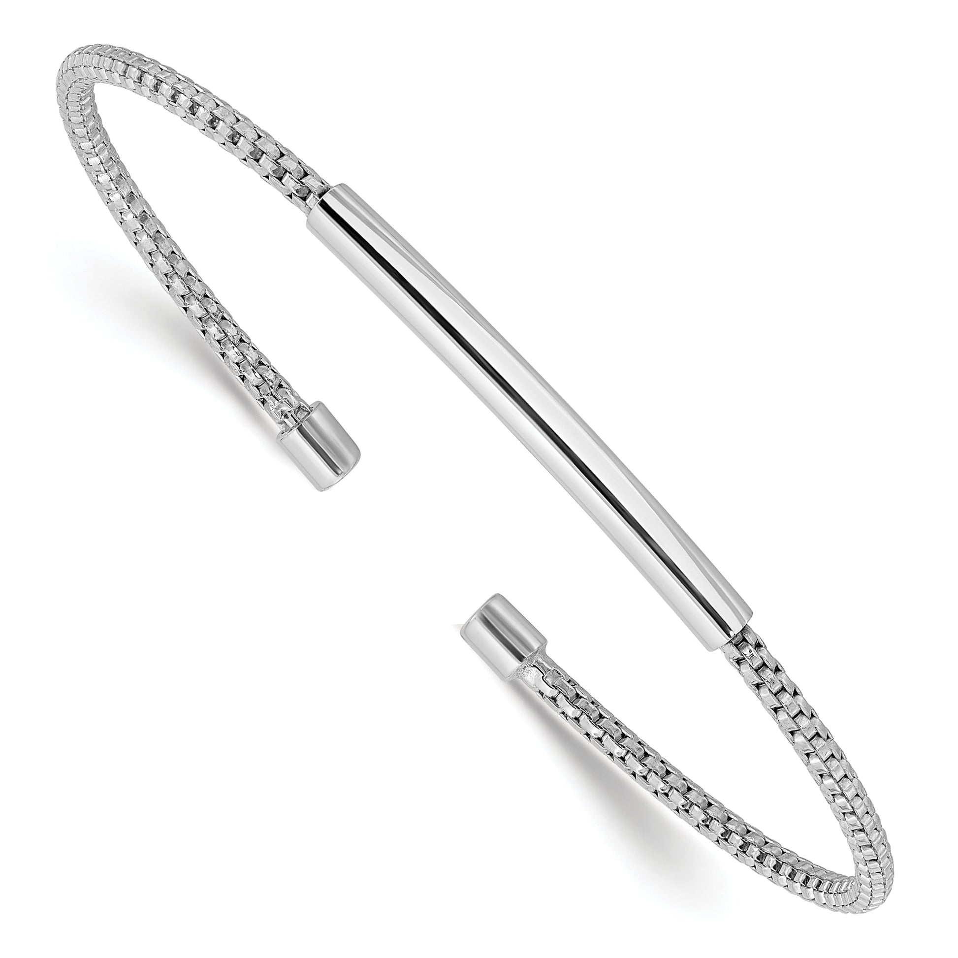 The Sterling Silver Rhodium-Plated Polished and Textured Cuff Bracelet adds a sleek touch to any look. Made from solid 925 sterling silver and finished with shiny rhodium, this bracelet shines with a polished and textured style. Its flexible design slips comfortably on the wrist, making it easy to wear all day. The bar-shaped charm measures about 30 mm long and 3 mm wide, offering a subtle accent. Perfect for women who want a chic, durable piece, the Sterling Silver Rhodium-Plated Polished and Textured Cuff Bracelet combines comfort and style effortlessly.