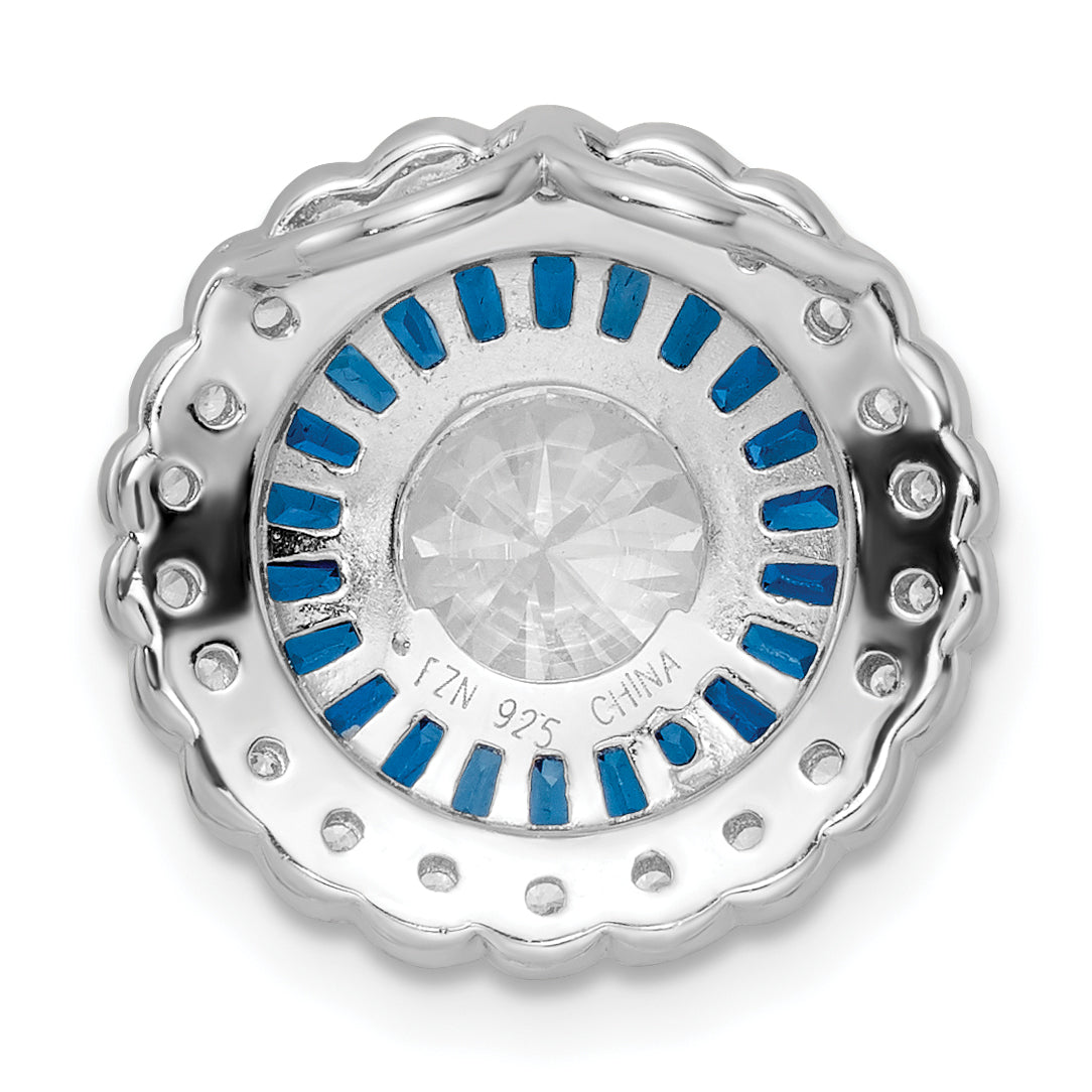The Sterling Silver Rhodium-Plated Polished Blue & White CZ Round Chain Slide offers a graceful touch to any look. Made from high-quality 925 sterling silver, this exquisite piece is plated with rhodium for a lasting shine. Brilliant blue and white cubic zirconia stones, each shaped to perfection in round and baguette cuts, create a mesmerizing effect. With 45 stones set meticulously, this pendant gleams with elegance. Measuring 16.33 mm across with a delicate thickness, it is crafted for sophistication. Elevate your jewelry collection with the Sterling Silver Rhodium-Plated Polished Blue & White CZ Round Chain Slide—a standout addition for those who appreciate fine craftsmanship.