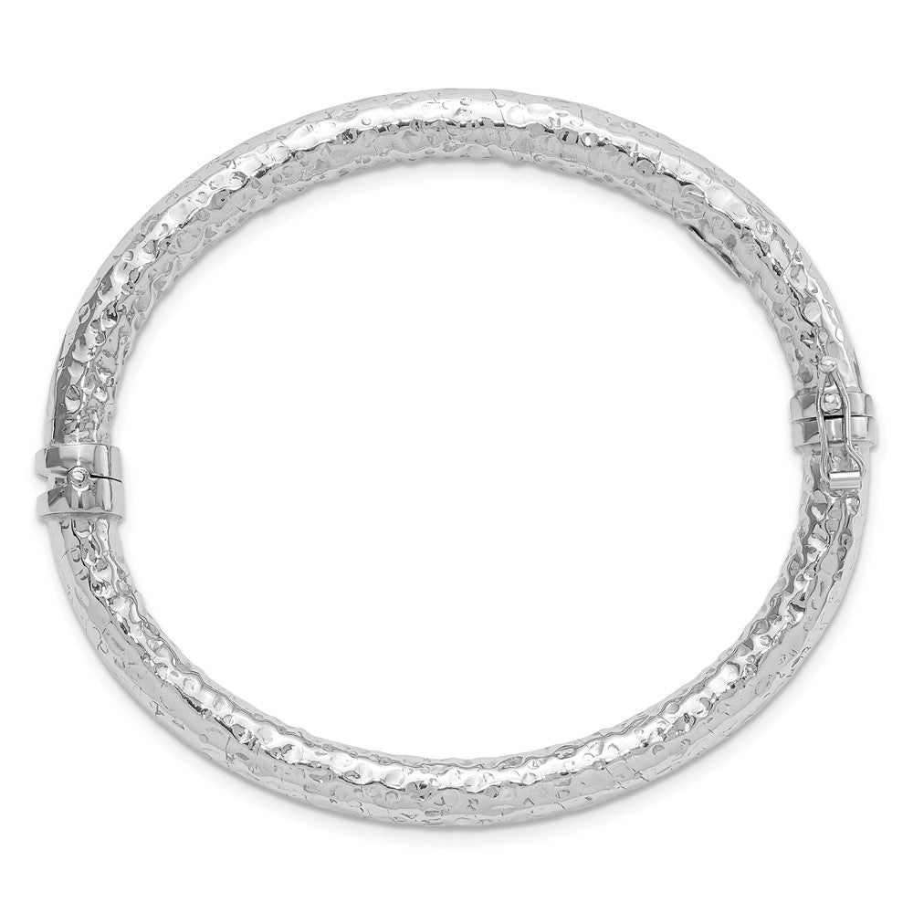 The Sterling Silver Rhodium-Plated Polished Hammered Bangle is perfect for everyday wear. Crafted from high-quality 925 sterling silver, it features a sleek, shiny finish with a hammered texture that adds a stylish touch. The bangle measures 6.25 mm wide and has a secure box catch for easy fastening. Its hinged design makes it simple to put on and take off. With a bright silver tone, this jewelry piece offers durability and a polished look that lasts a lifetime. The Sterling Silver Rhodium-Plated Polished Hammered Bangle combines elegance and practicality, making it a must-have accessory.