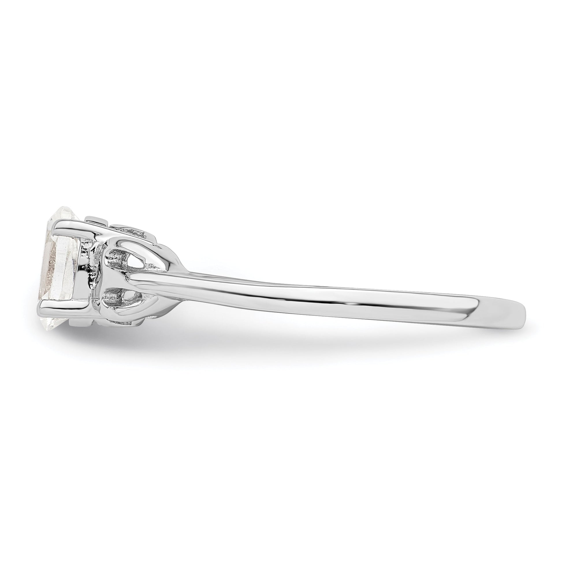 Meet the Sterling Silver Rhodium-Plated White Topaz Ring, a stunning piece of jewelry crafted for elegance. This ring features a shimmering white topaz, cut in a classic oval shape, measuring 6 x 4 mm. This natural gemstone weighs 0.553 carats and catches eyes with its pristine white color. Set with care, the topaz rests in a secure prong setting atop a solid sterling silver band, which is rhodium-plated for extra shine and durability. With its polished finish and delicate 2 mm band, this ring offers an enduring allure. The Sterling Silver Rhodium-Plated White Topaz Ring makes a heartfelt gift, especially for those born in April.