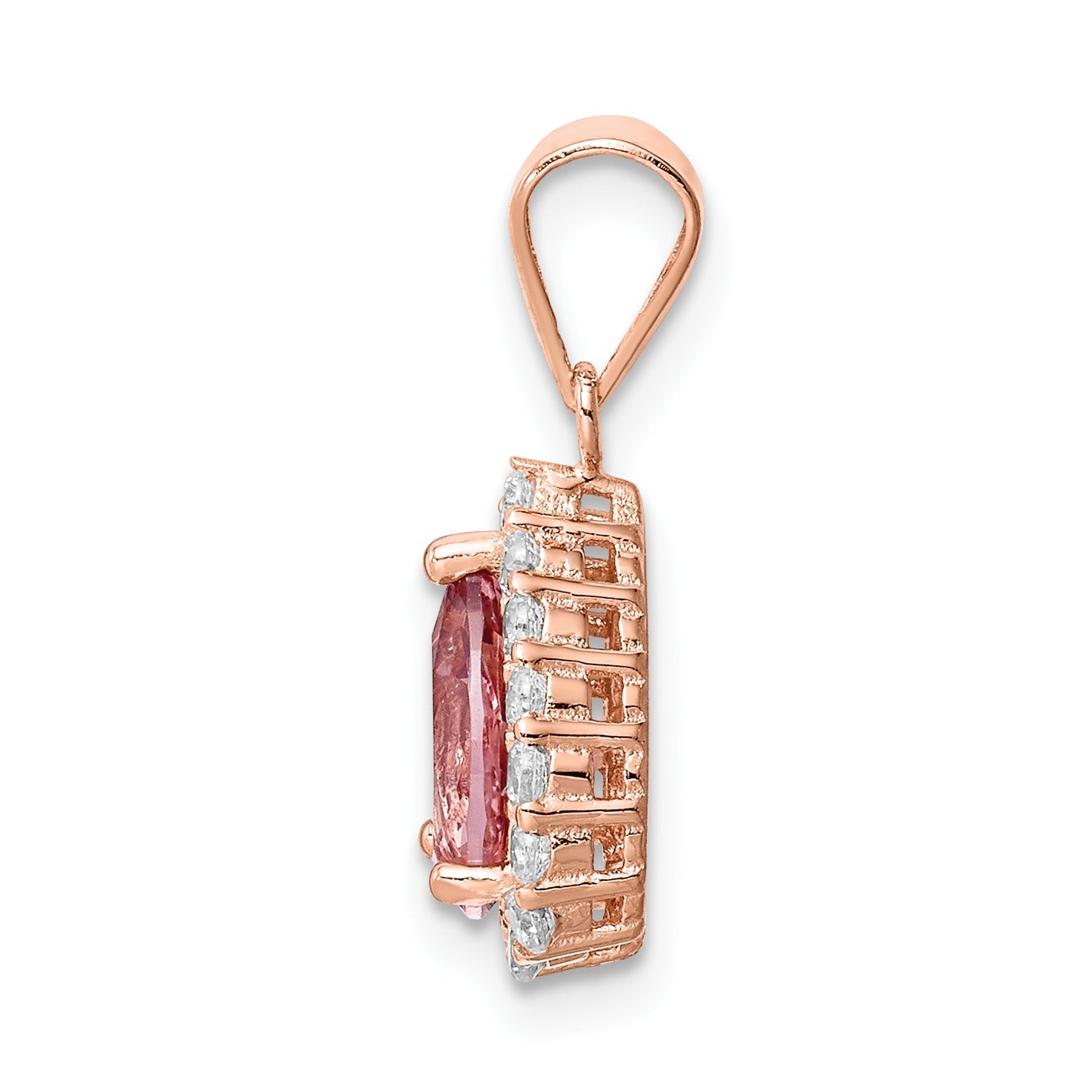 The Sterling Silver Rose-Tone Pink Crystal Center and CZ Teardrop Pendant is a stunning piece that captivates with its elegant design. Crafted from polished sterling silver, it features a striking pink crystal at its center and is adorned with synthetic cubic zirconia stones for added sparkle. The pendant measures 18.88 mm in length, with an eye-catching teardrop shape crafted to perfection. A touch of gold and silver flash plating enhances its shimmer, while the rose-tone finish provides a subtle, warm glow. This pendant is both complete and exquisite, making it a perfect choice for any jewelry lover.