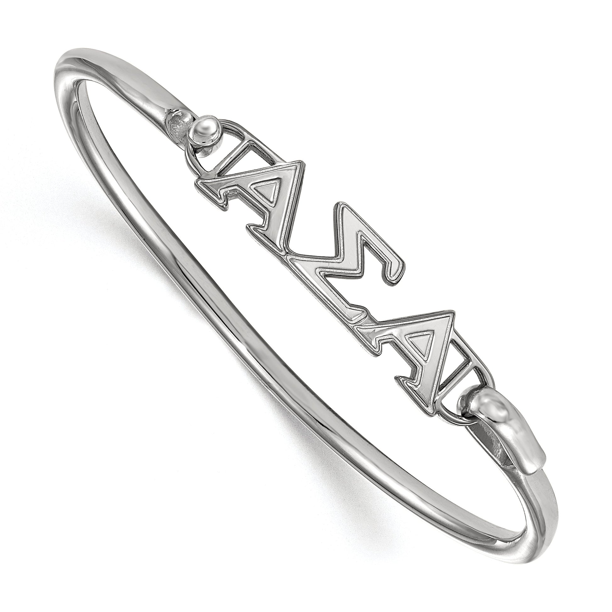 The Sterling Silver S. Rh-P Logoart Alpha Sigma Small Hook and Clasp Bangle offers a sleek, polished look for your everyday style. Made from 925 sterling silver, this bracelet features a smooth, shiny finish and a comfortable 7-inch length. Its small charm measures 13 mm by 33 mm and showcases the Alpha Sigma Alpha logo prominently. The secure hook clasp makes it easy to wear and take off daily. Perfect for fans of the sorority, the bangle combines quality and style, ensuring it stays a favorite piece in your jewelry collection.