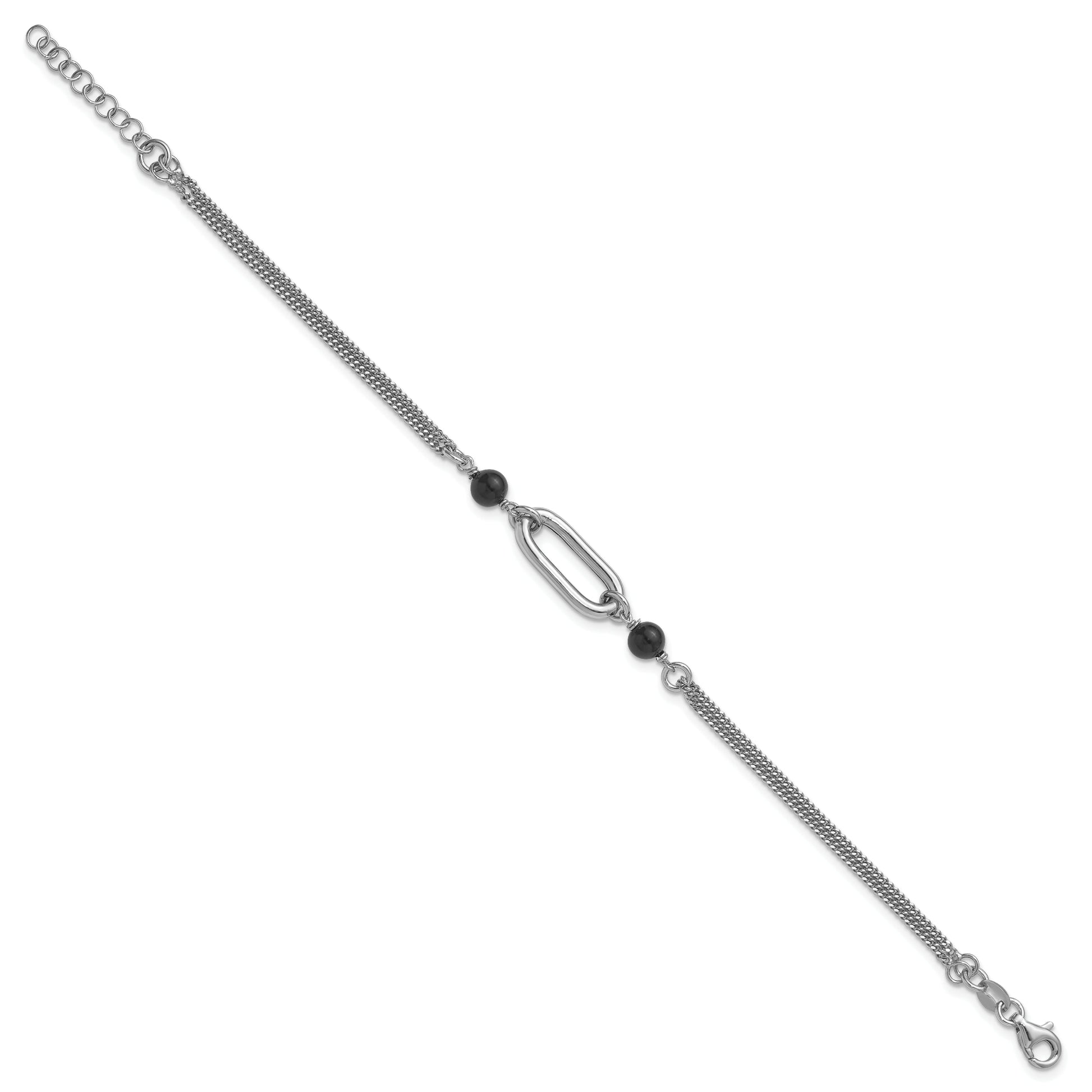 Discover the charm of the Sterling Silver Ss Rh-Pltd Black Glass Pearl 2-Strand Link W/1In Ext Bracelet. Crafted from high-quality sterling silver, this bracelet features two elegant black glass pearls that catch the eye. The rhodium plating adds a bright silver shine and resists tarnish. Its flexible design makes it comfy to wear, and the multi-strand links give it a bold look. The 7-inch chain has a 1-inch extender, so you can find your perfect fit. A sleek lobster clasp keeps it secure. Perfect for adding a touch of class to any outfit, the Sterling Silver Ss Rh-Pltd Black Glass Pearl 2-Strand Link W/1In Ext Bracelet elevates your style effortlessly.