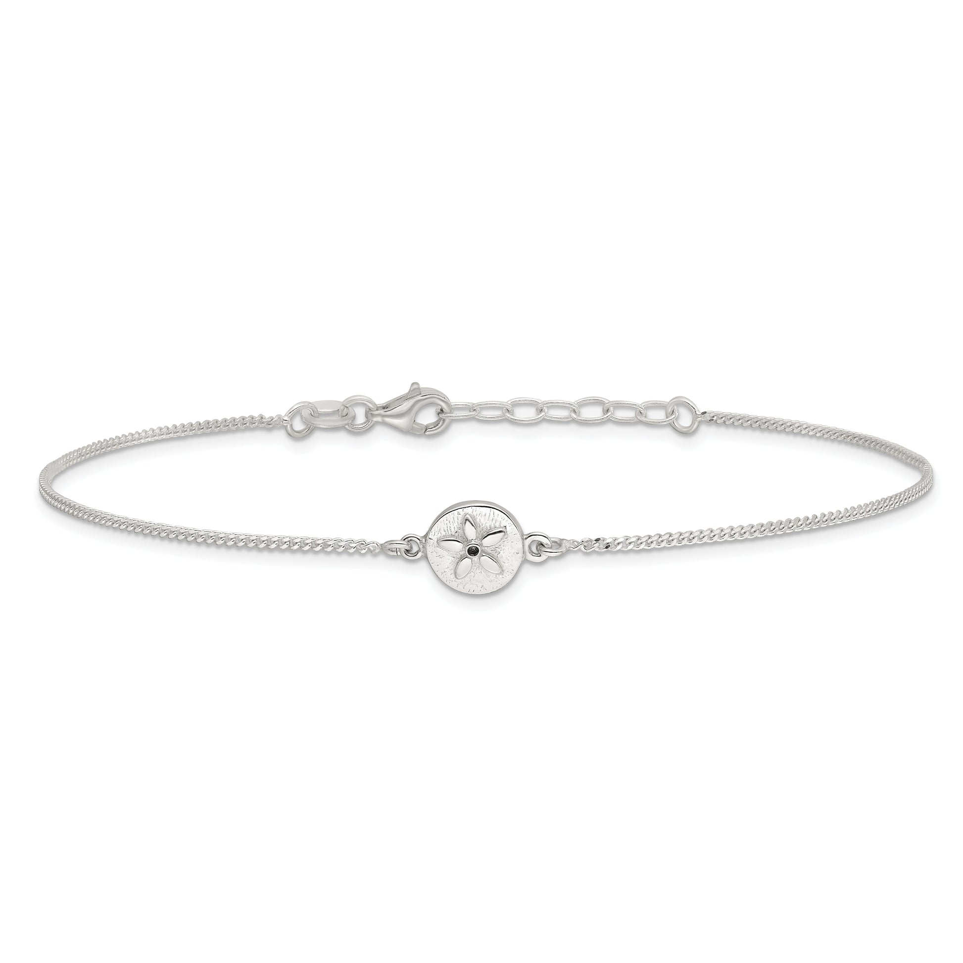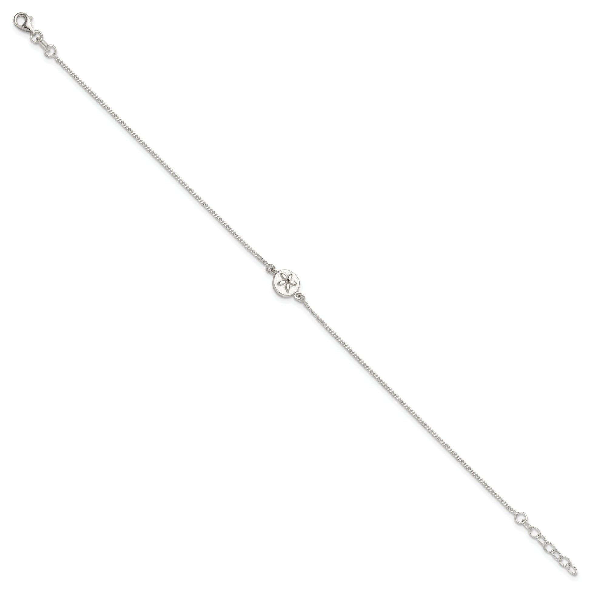 Embrace the charm of the ocean with our Sterling Silver with CZ Sand Dollar Anklet. Crafted from high-quality 925 sterling silver, this anklet features a gleaming polished finish and a sparkling cubic zirconia gem. The sand dollar charm, measuring 14.5 mm by 8.8 mm, adds an elegant coastal touch. The anklet offers a comfortable fit with its 9-inch curb chain and an additional 1-inch extender. A durable lobster clasp ensures it stays secure. Anti-tarnish coating keeps it shiny and fresh. Elevate your style with this stunning Sterling Silver with CZ Sand Dollar Anklet.