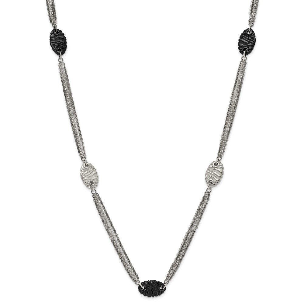 The Titanium/Silver Two-Tone Titanium Sterling Silver Black Ti Polished And Etched Oval Station Necklace is a chic piece perfect for women. Its 36-inch cable chain features a textured design with five etched and polished oval stations. Crafted from durable titanium and sterling silver, it offers a sleek two-tone look with hints of yellow accents. The lobster clasp ensures a secure fit. Whether worn alone or layered, this beaded necklace adds a touch of modern elegance. The Titanium/Silver Two-Tone Titanium Sterling Silver Black Ti Polished And Etched Oval Station Necklace is a versatile choice for any outfit.